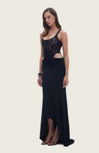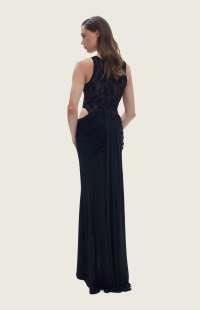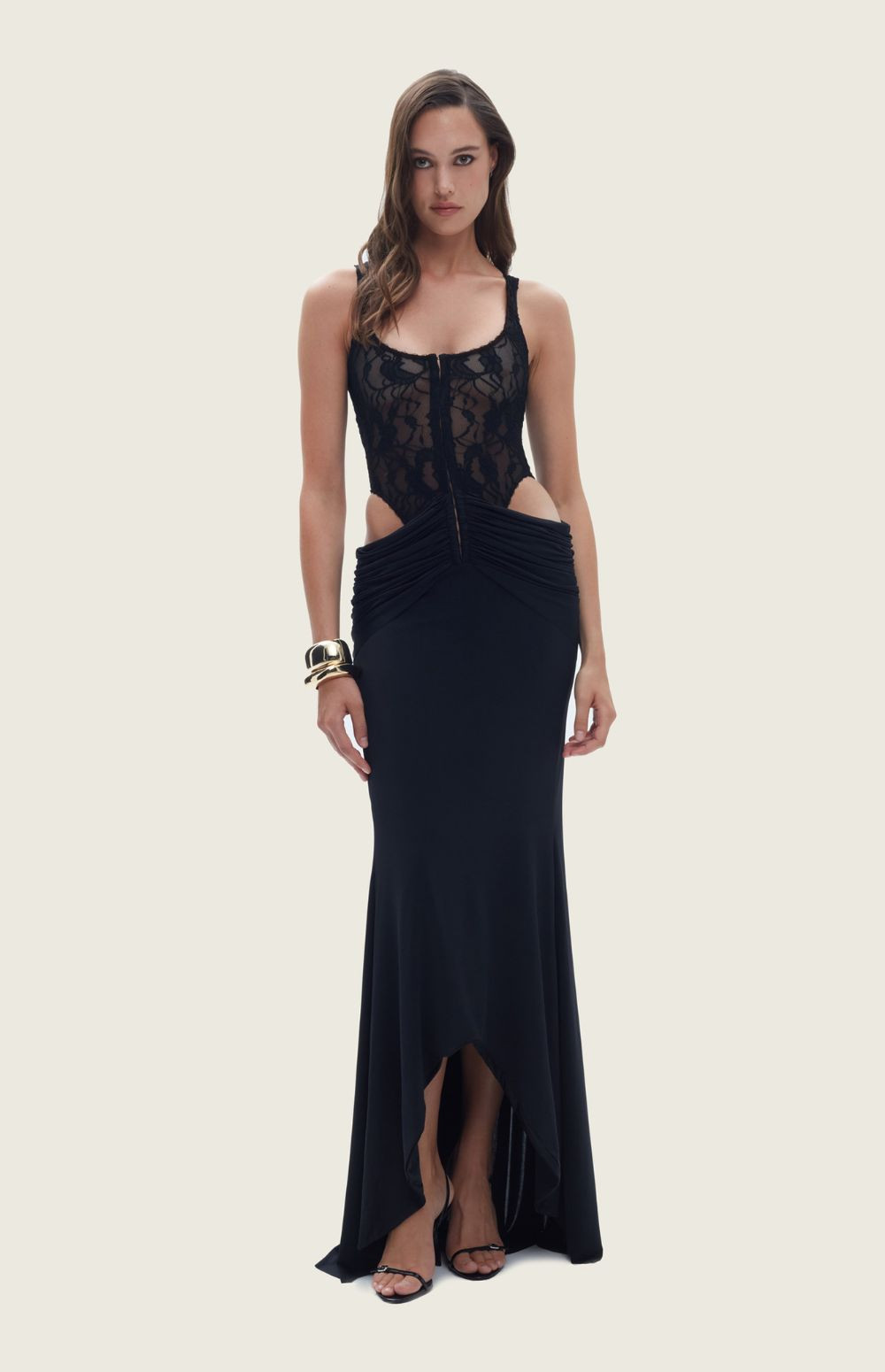 Command attention with this show stopping gown that perfectly balances sensuality and sophistication. The fitted lace bodice, crafted from delicate stretch lace, beautifully sculpts the upper body while revealing just the right amount of skin through its sheer detailing. The skirt, made from soft, flowing jersey, features dramatic draping at the hips and a cascading back panel that creates graceful movement with every step.