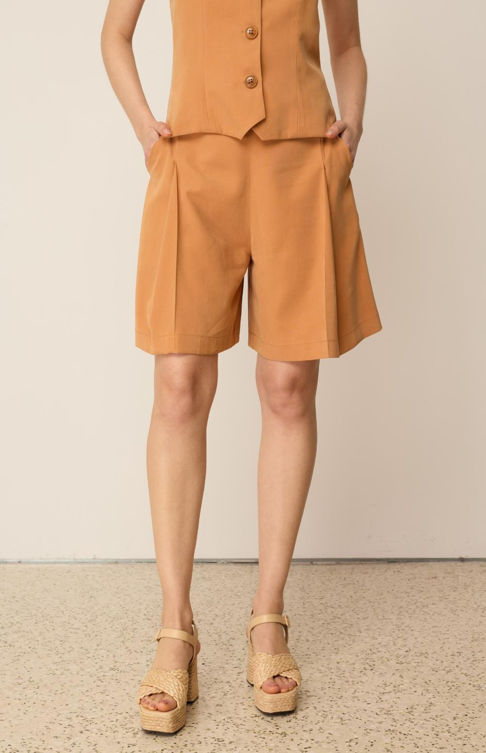 Elevate your everyday summer wardrobe with this stylish bermuda shorts that combines the office aesthetics with the carefree summer vibe. It has two side pockets and pleats for perfect fit. Wear it with its matching vest and jacket for a total look of elegance.