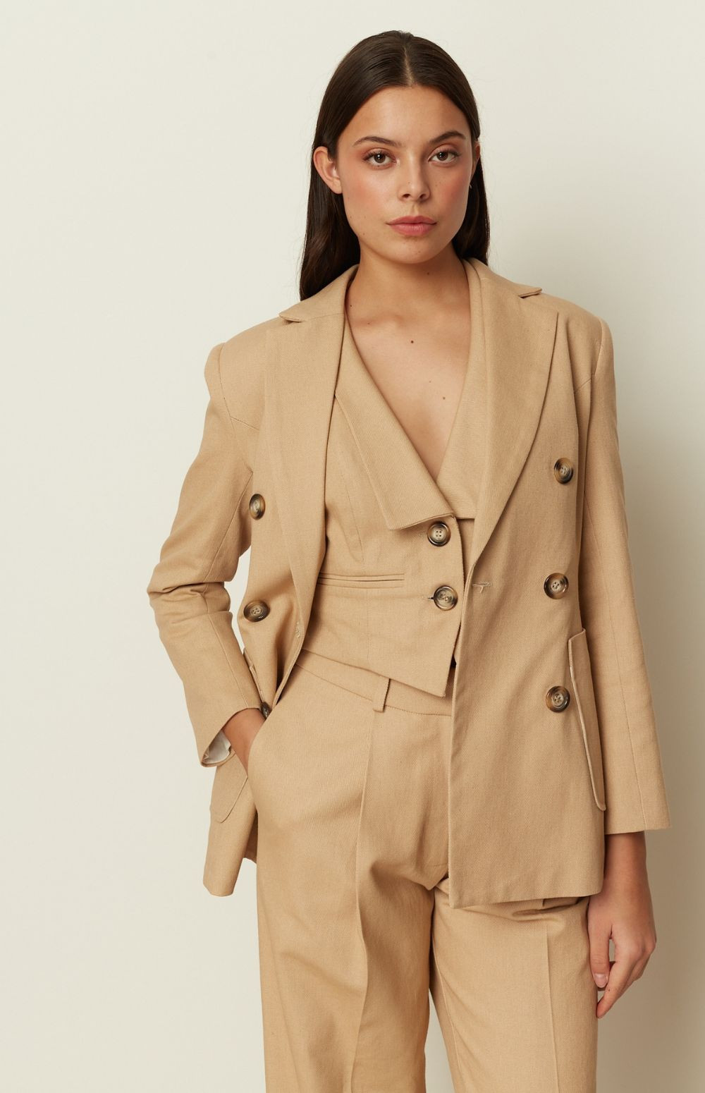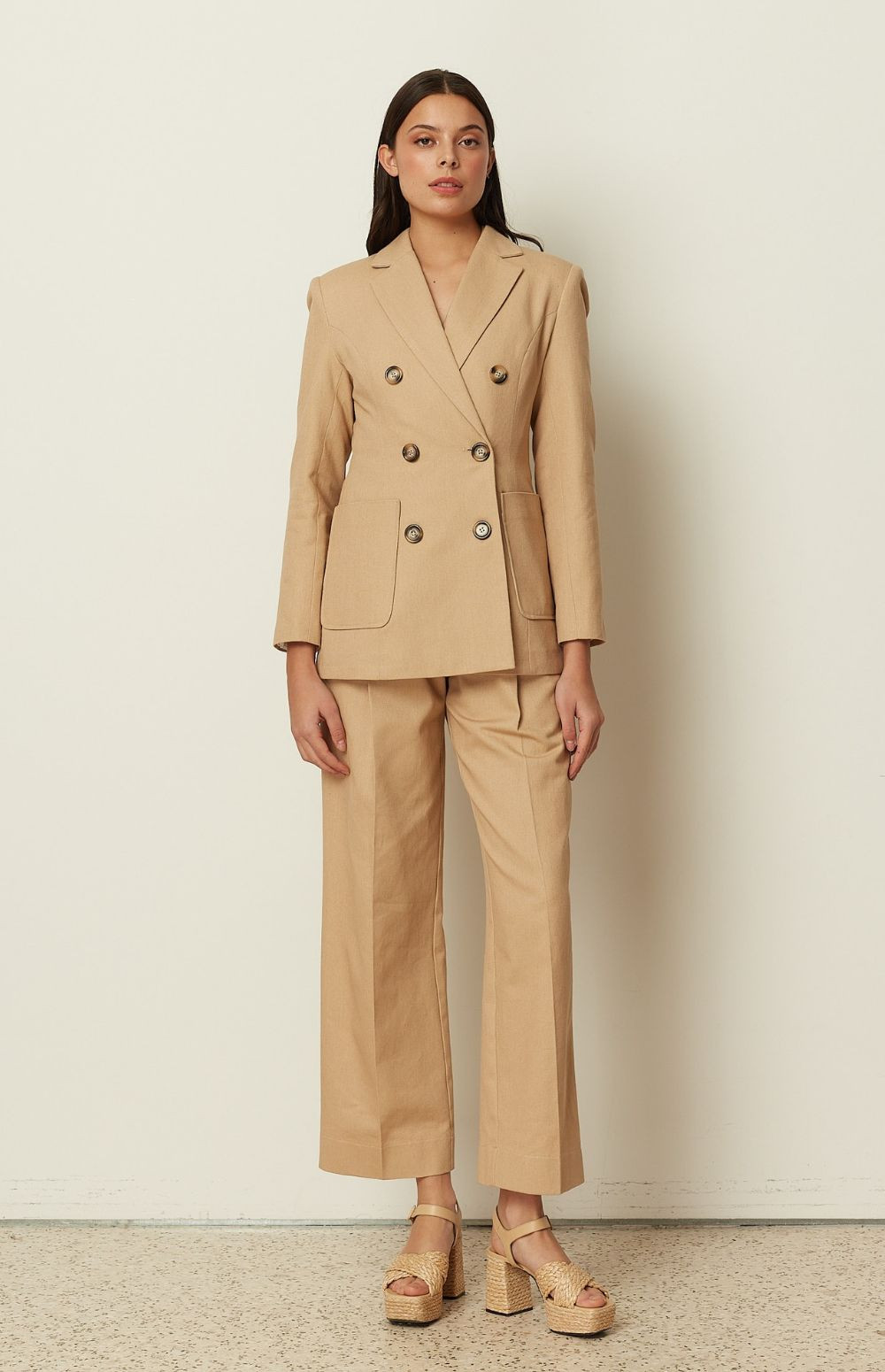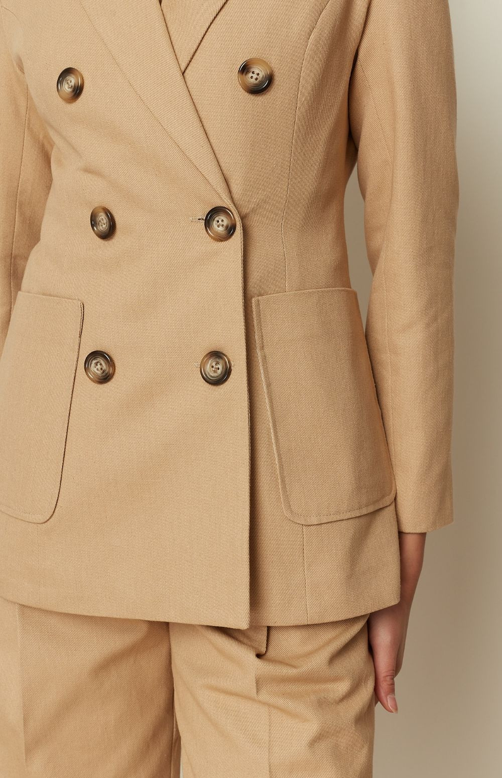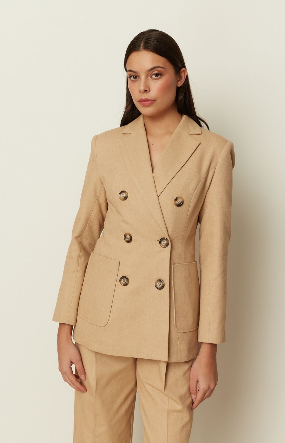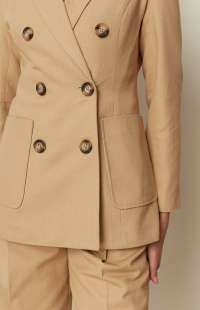 A sharp tailoring icon by ckontova, this double-breasted blazer is cut in a structured silhouette with a defined shoulder and a clean, elongating line. Finished with classic peak lapels, statement buttons and roomy patch pockets, it balances timeless suiting with a modern, slightly relaxed feel. Wear it with the matching trousers for a polished power set, or style it over a simple top and denim for effortless elevated dressing.