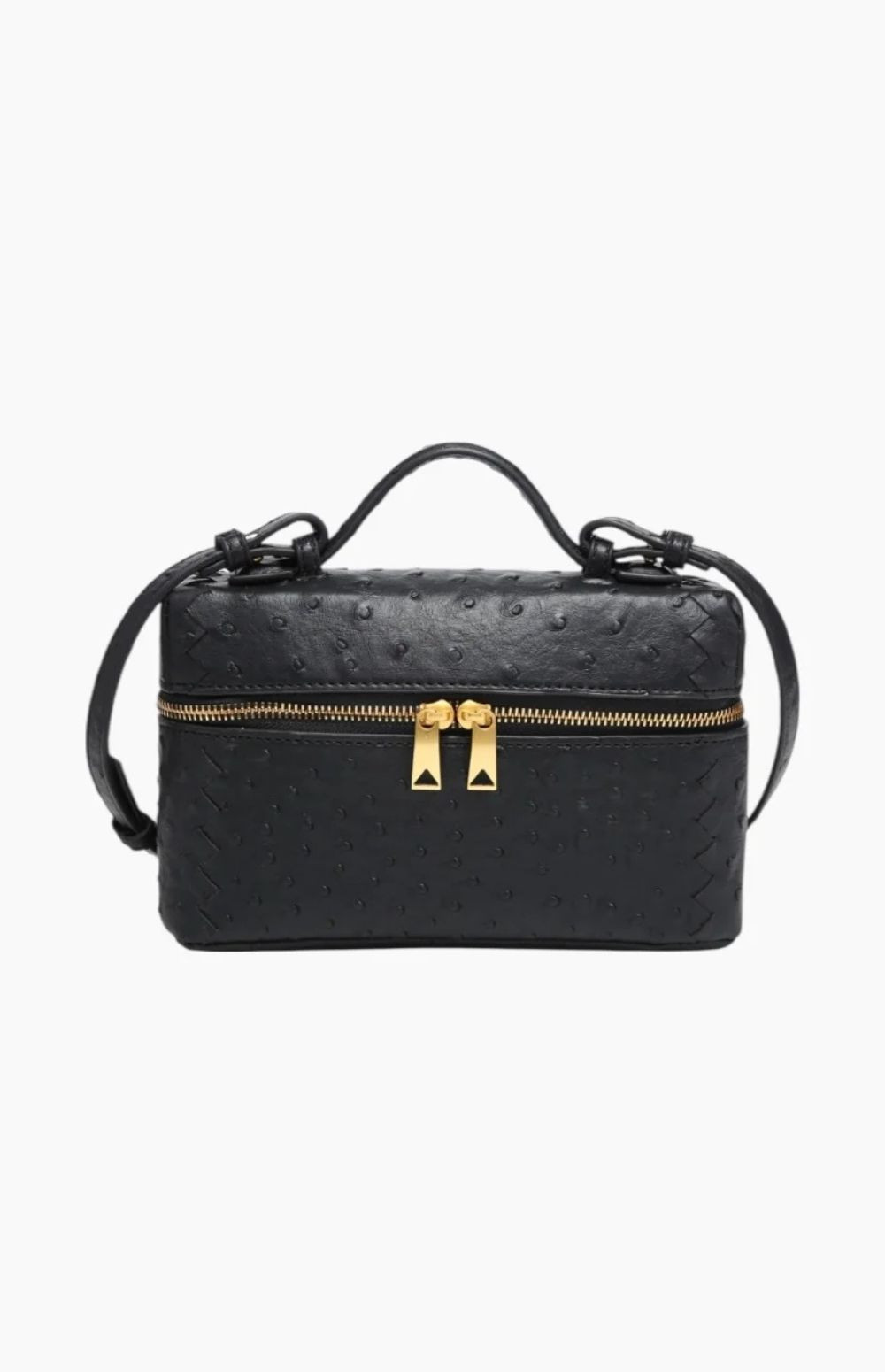 The bag has a rectangular, box-shaped silhouette and closes with a zipper.