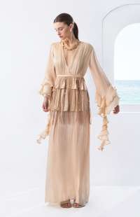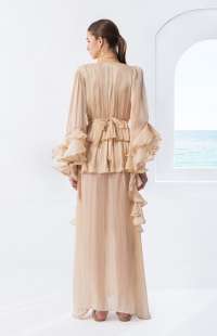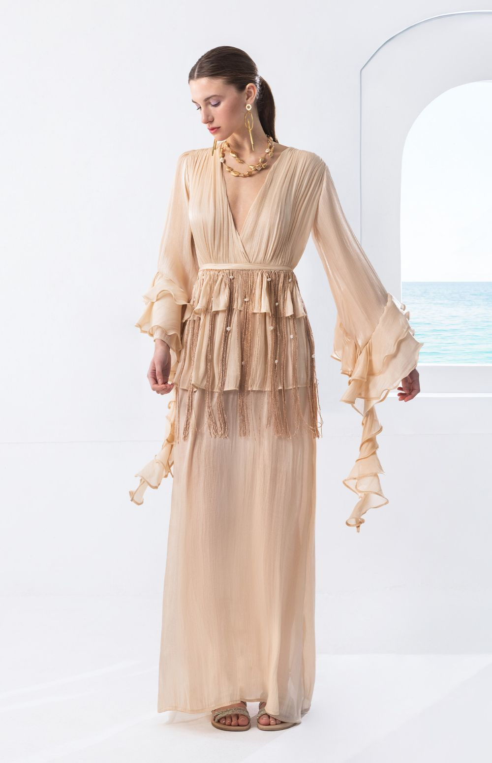 Maxi dress in a warm nude-gold tone, crafted from airy fabric with refined luminosity. The deep V neckline enhances the silhouette with elegance, while the long sleeves featuring dramatic ruffle details create fluid movement with every step.