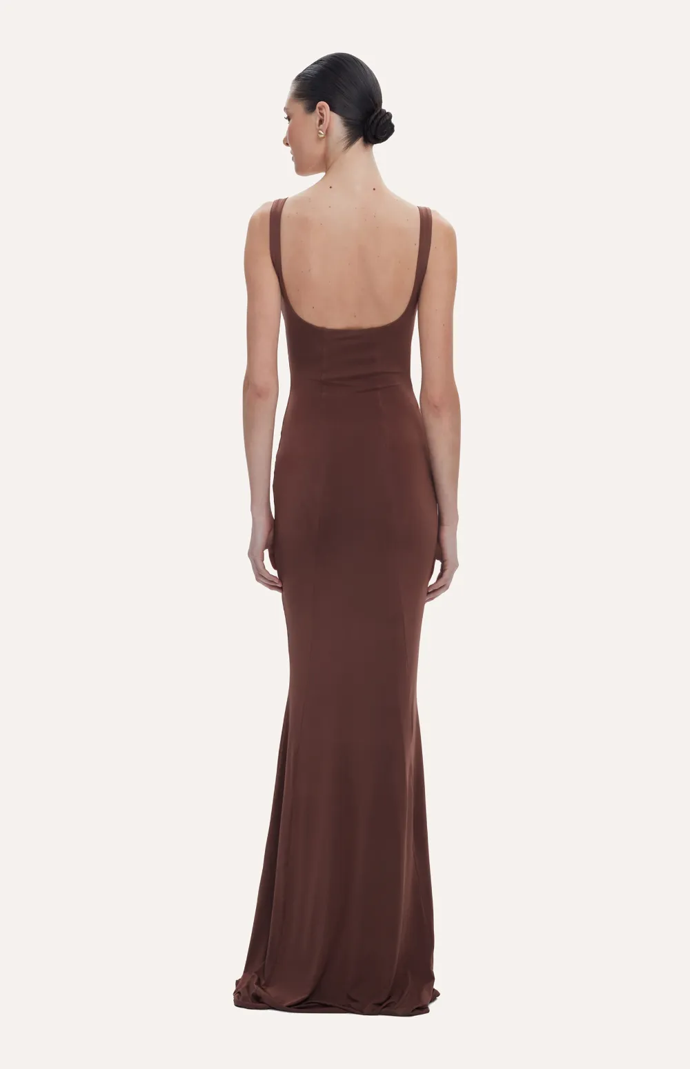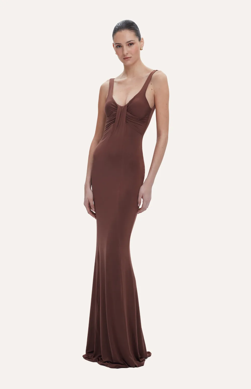 Graceful from every angle, this mermaid hem maxi dress combines timeless elegance with a modern edge. The draped V-neckline flows into a curve-skimming silhouette, crafted in super jersey for a soft yet structured feel. With a subtle flare and fluid movement, it’s a refined piece made in Greece to leave a lasting impression.