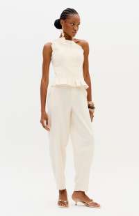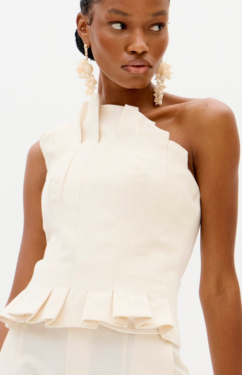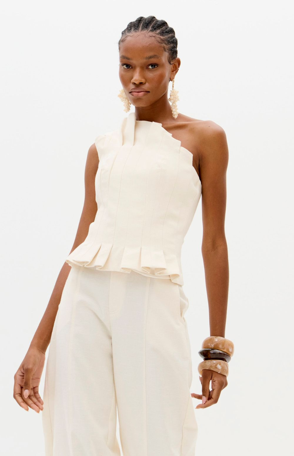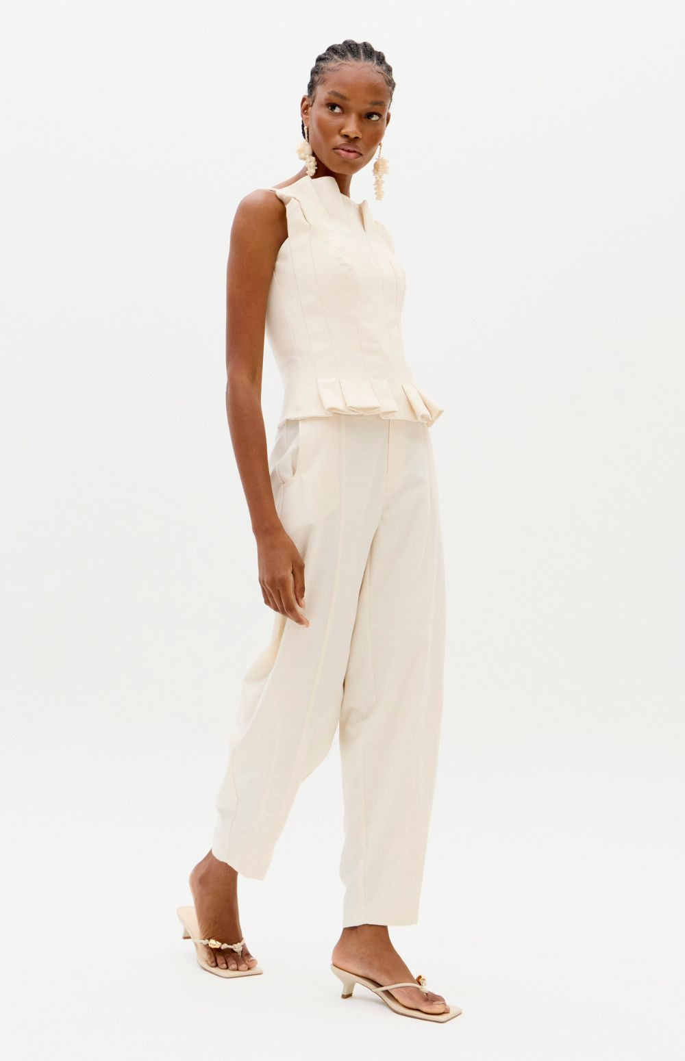 The top features a structured, sleeveless design with a high, funnel-style neckline. It is tailored through the torso to create a cinched waist, which then flares into a sharp box-pleated peplum at the hem.