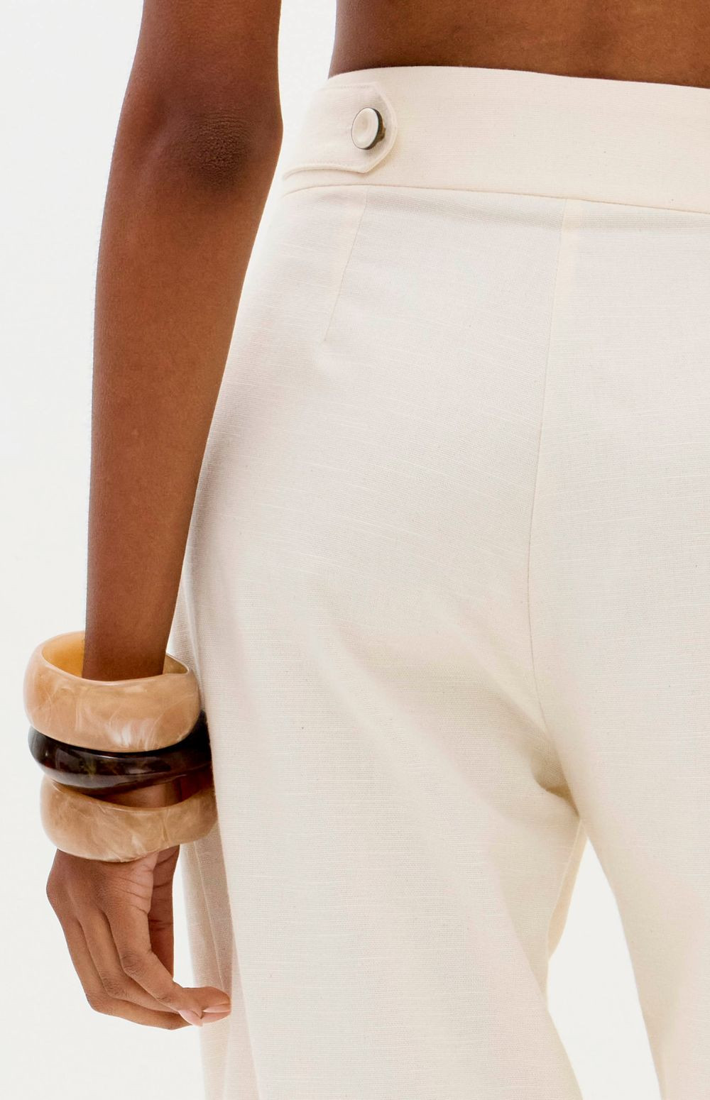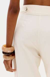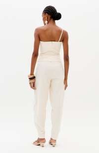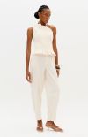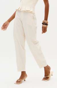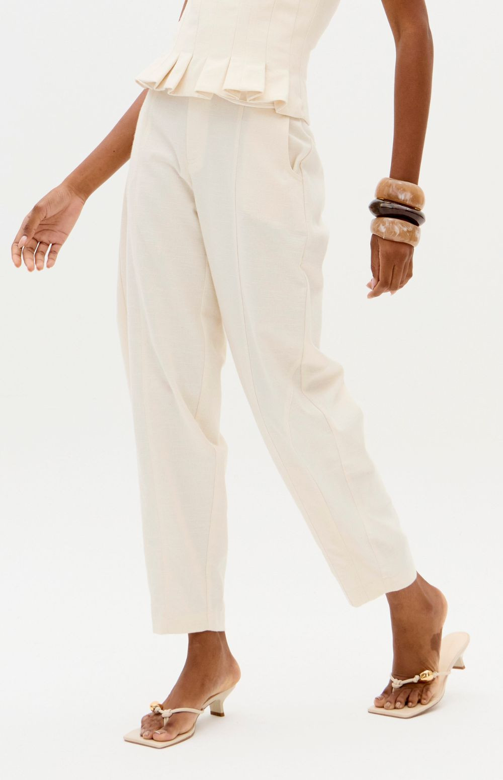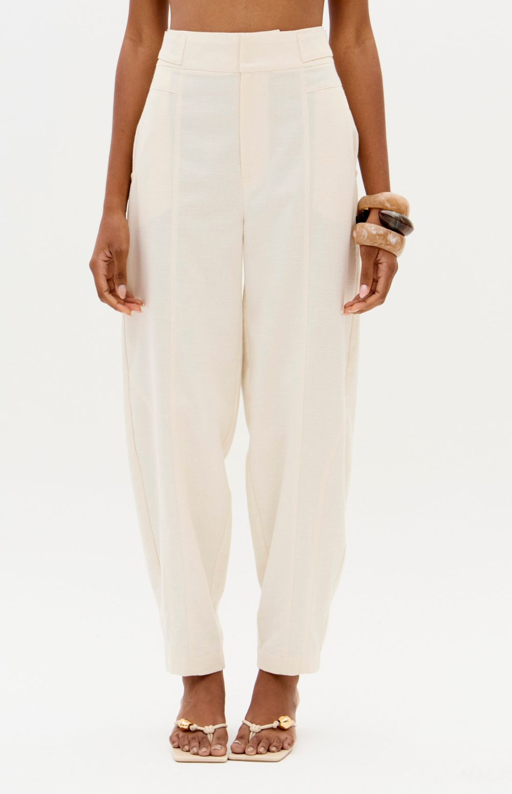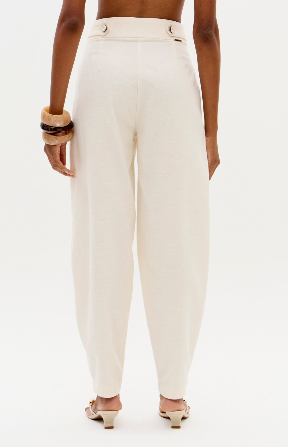 The trousers are styled in a trendy barrel or "baggy" fit, offering a voluminous shape that curves out at the thigh and tapers toward the ankle. They feature front darting and a high-waist cut to maintain a polished look despite the relaxed leg.