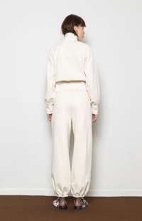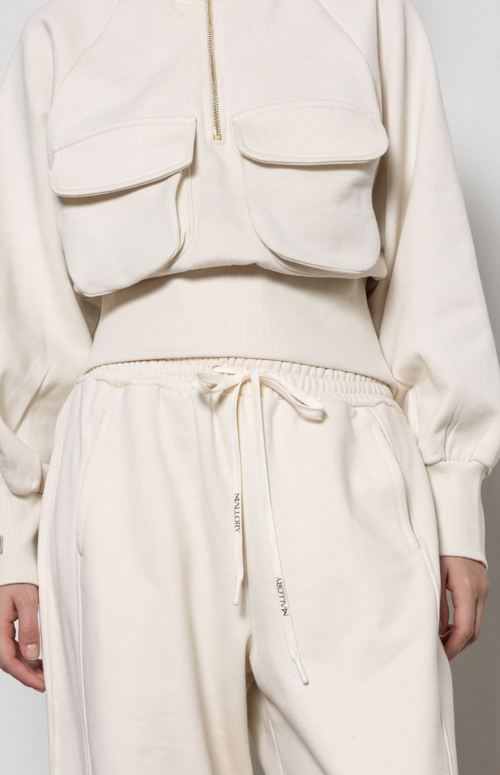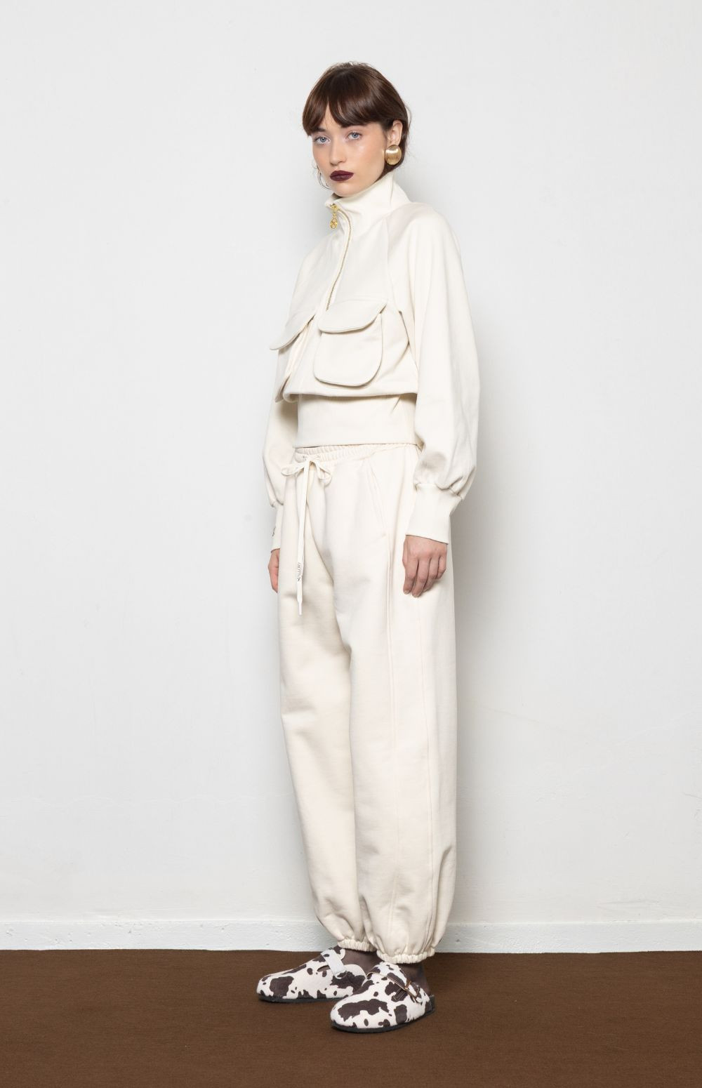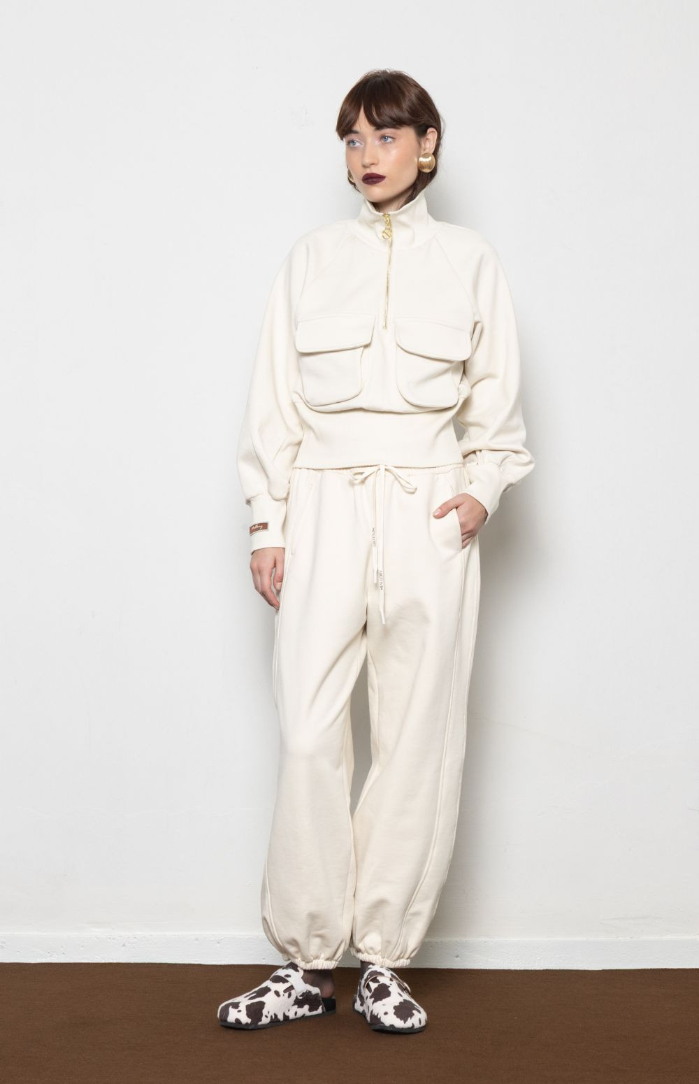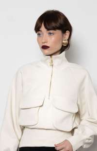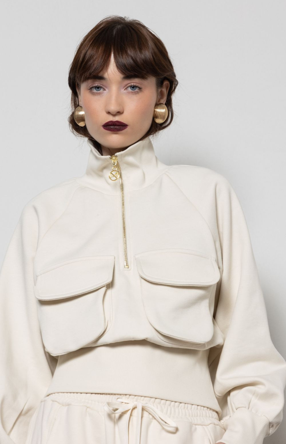 • Cropped Ecru sweatshirt with front utility pockets and gold zip —sporty, sleek, and effortlessly cool.