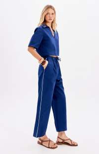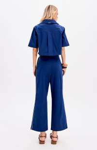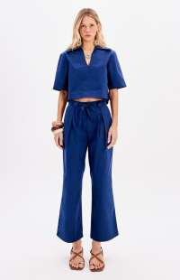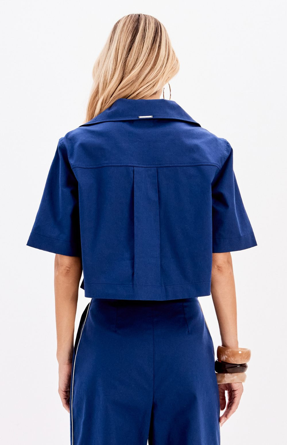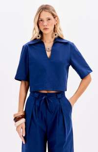 This cropped blouse with short sleeves features a structured polo collar. Made from a substantial, soft-touch fabric, it has seams and darts that ensure a modern fit.