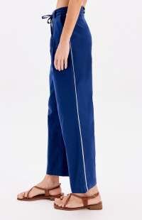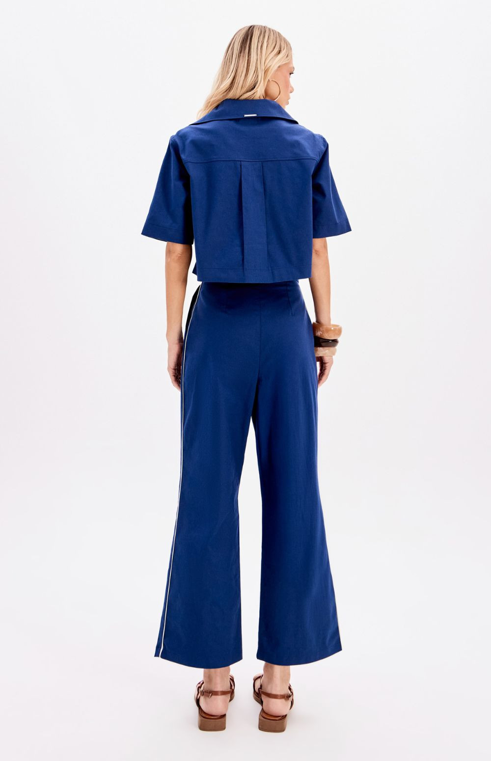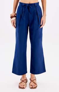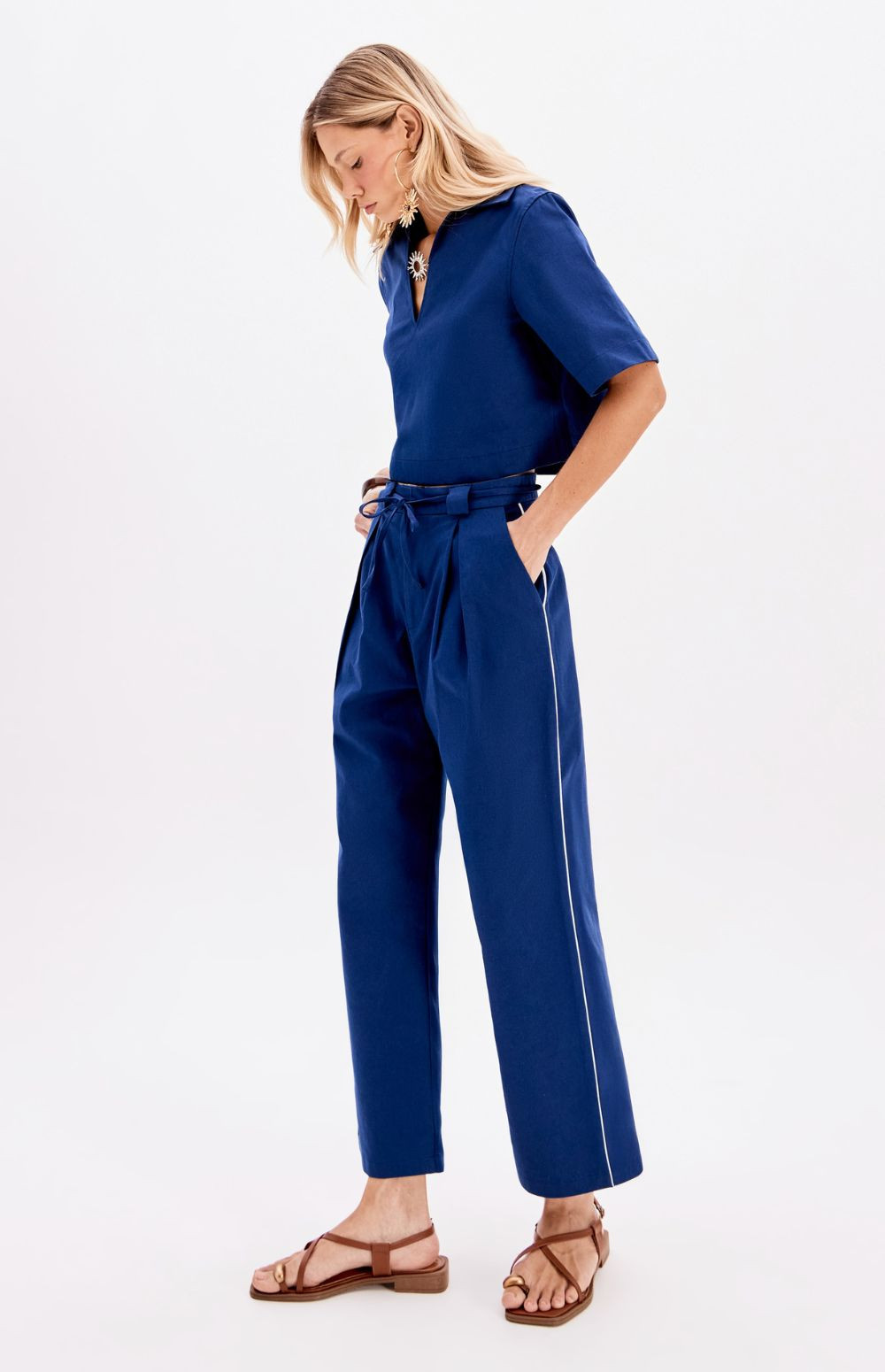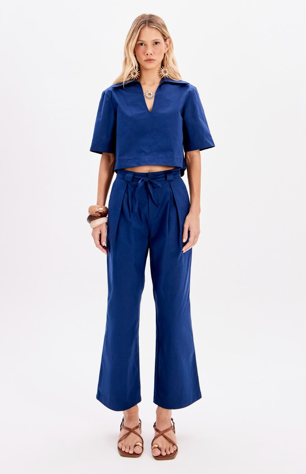The trousers are a high-waisted, wide-leg style featuring a pleated front and a matching tie-belt.
