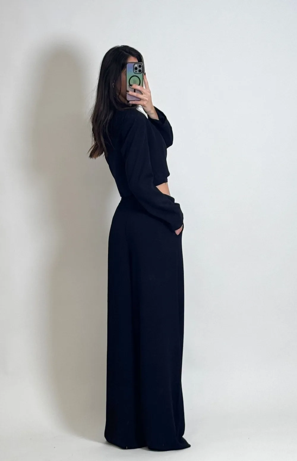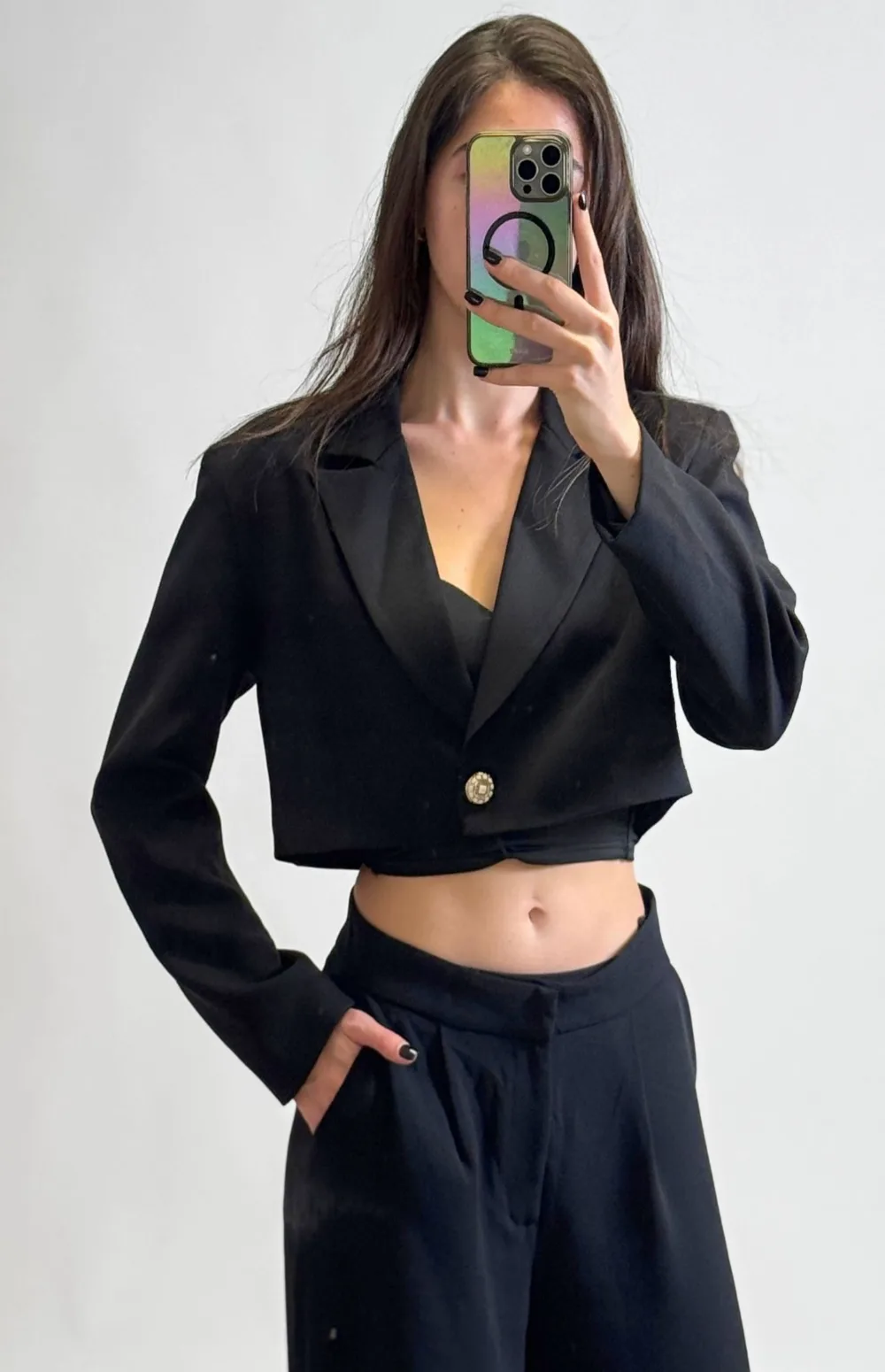 The long-sleeved cropped blazer, crafted from a heavyweight tailored fabric, features elegant lapels, a v-neckline, and a front button closure. The form-fitting design ensures a comfortable and modern fit.