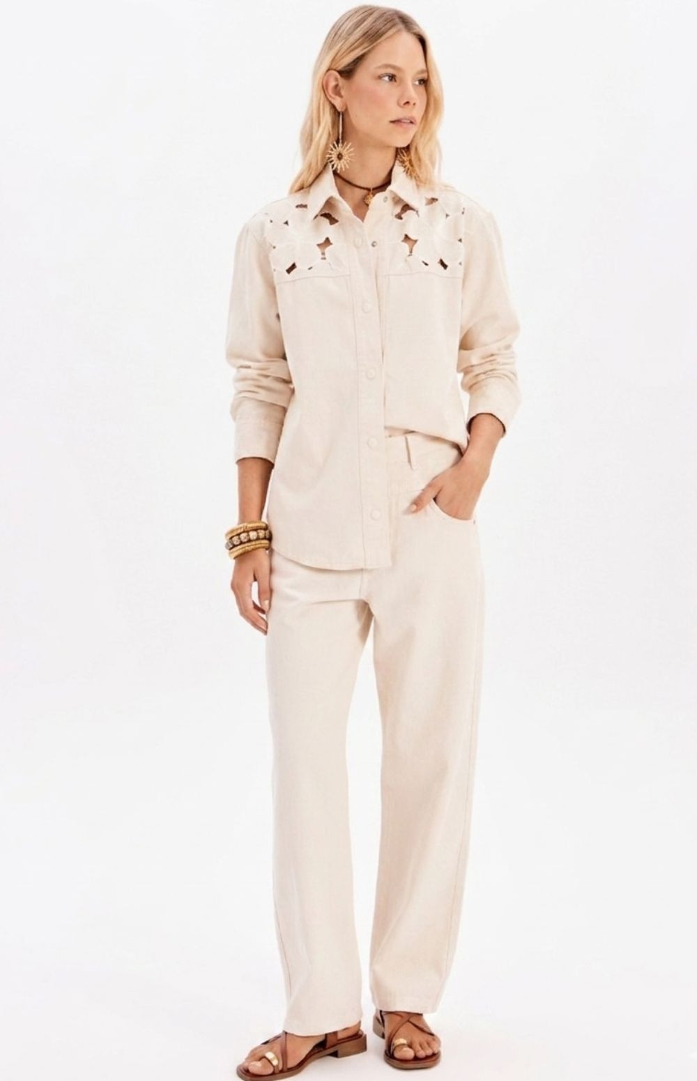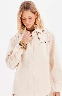 Floral embroidery with geometric hole patterns (cut-outs) on the front and back yoke.