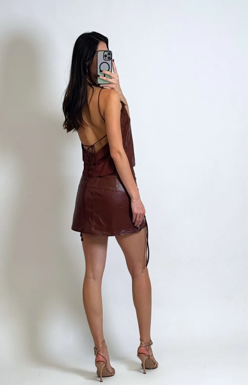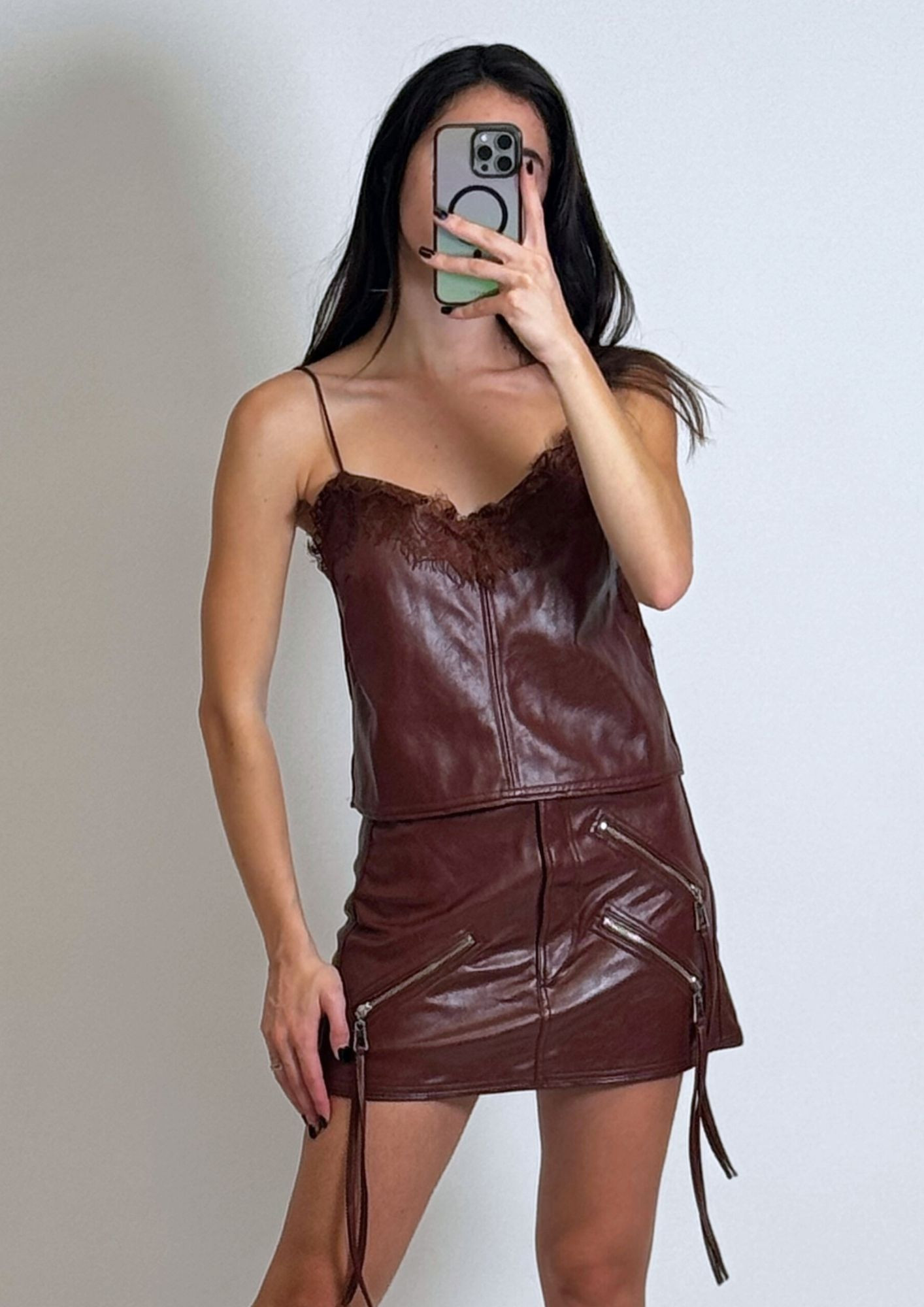 Leather look top with thin straps and lace details & mini skirt with zipper pocket like details