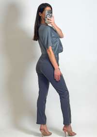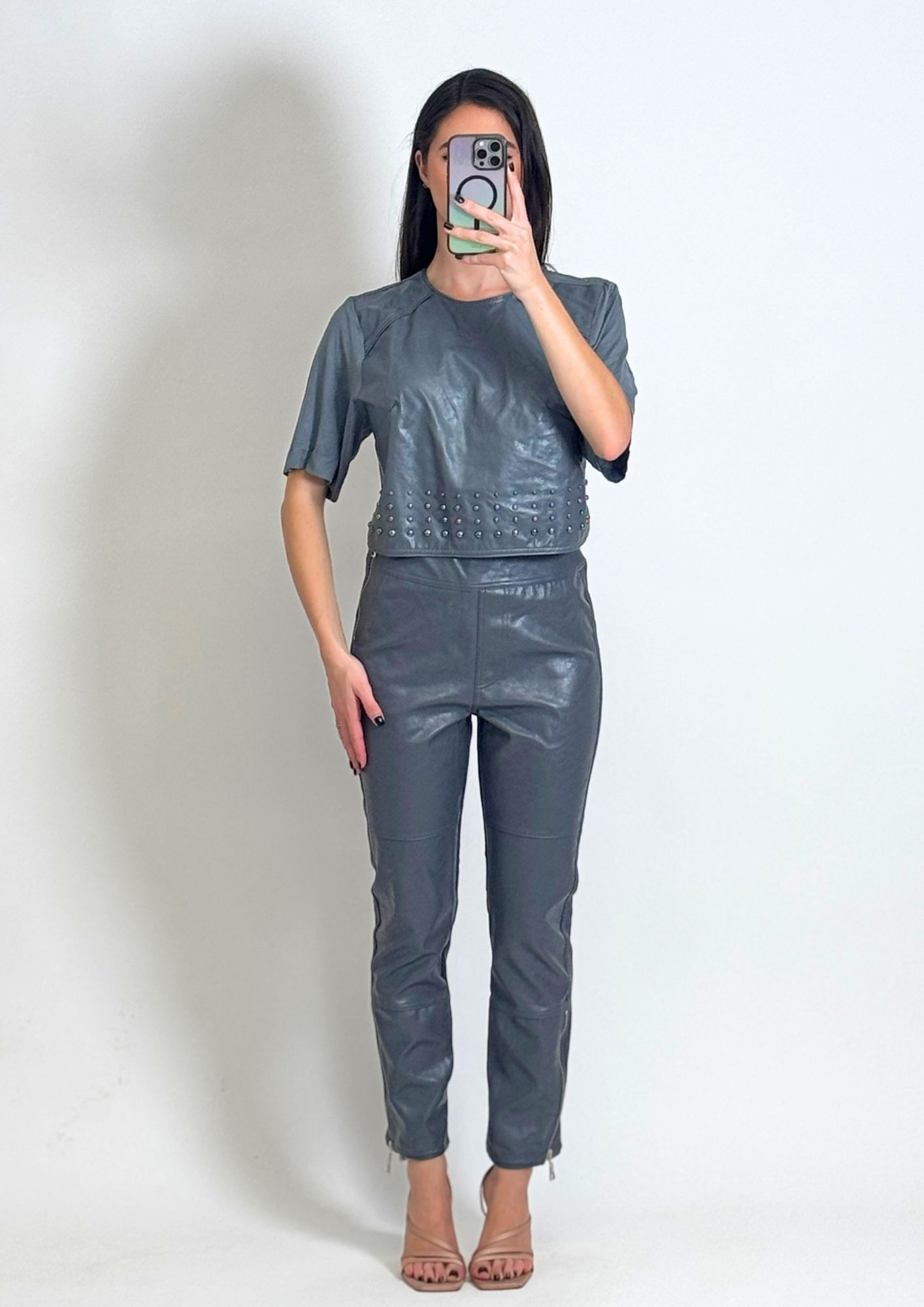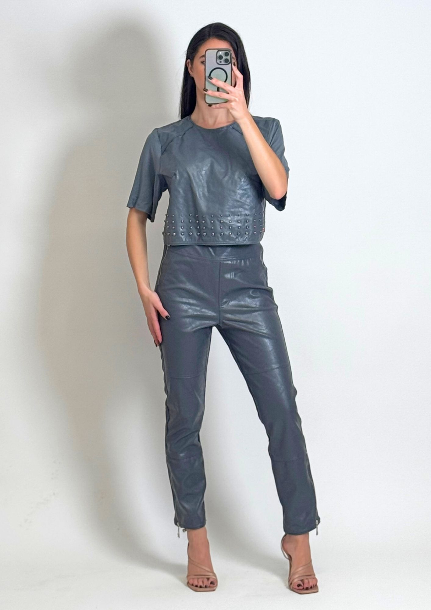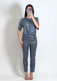 Pants: Fitted fit, 7/8 length, high waist, zippers at the ankles. Functional zippers at the ankles, impeccable finish, faux leather texture.