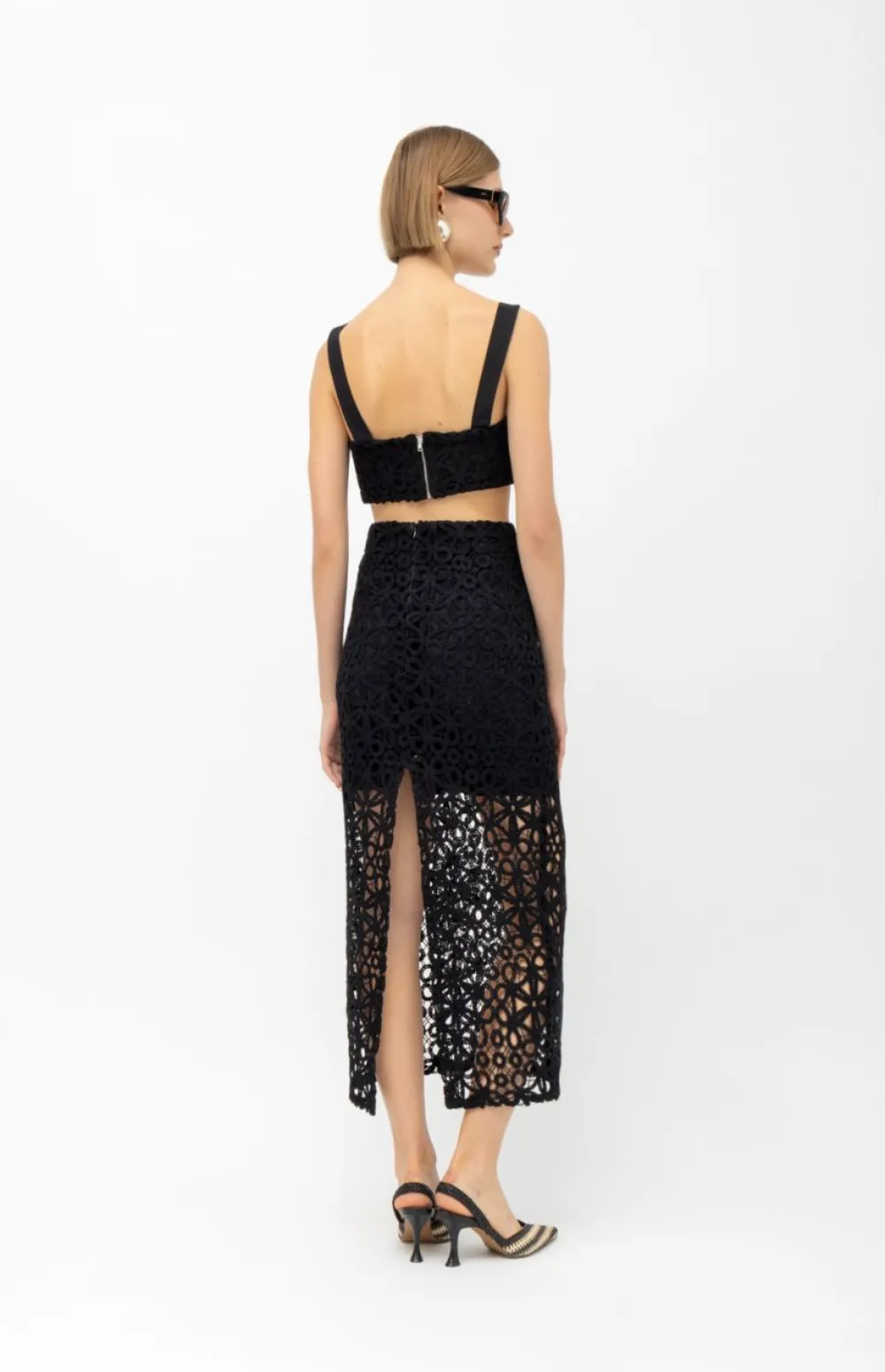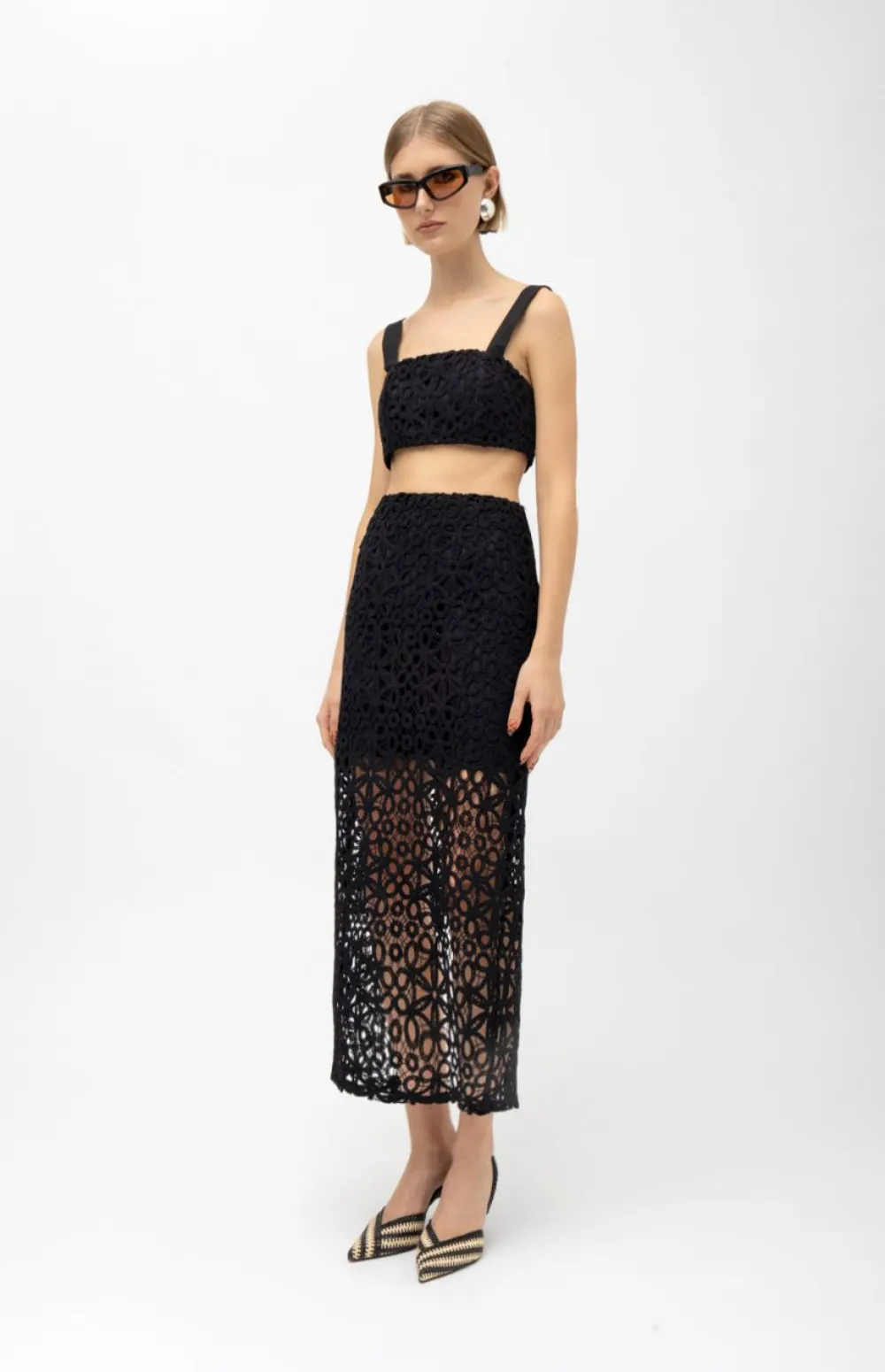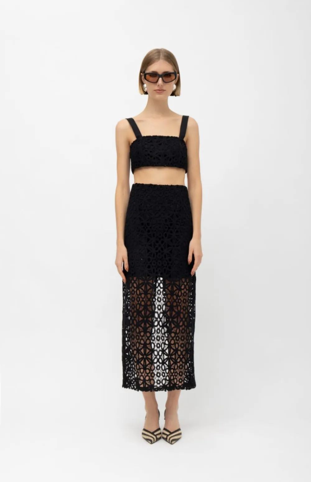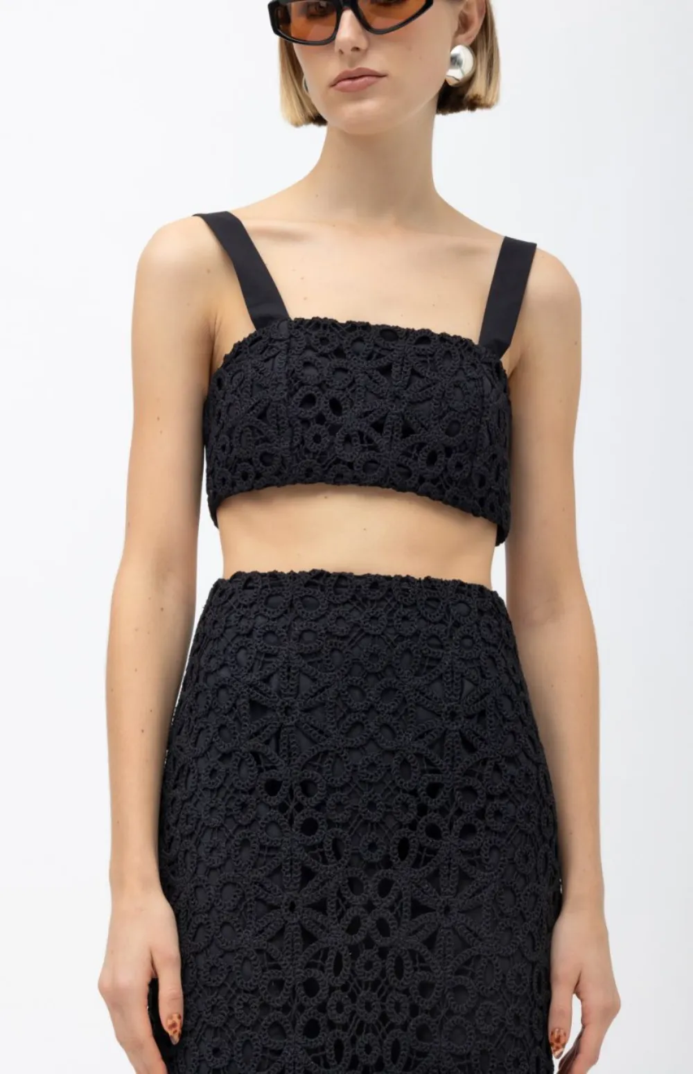 Minimal lines meet artisanal texture in this standout crochet crop top. Crafted with intricate floral motifs, it features wide straps and a structured silhouette—perfect for both layered looks and summer minimalism.