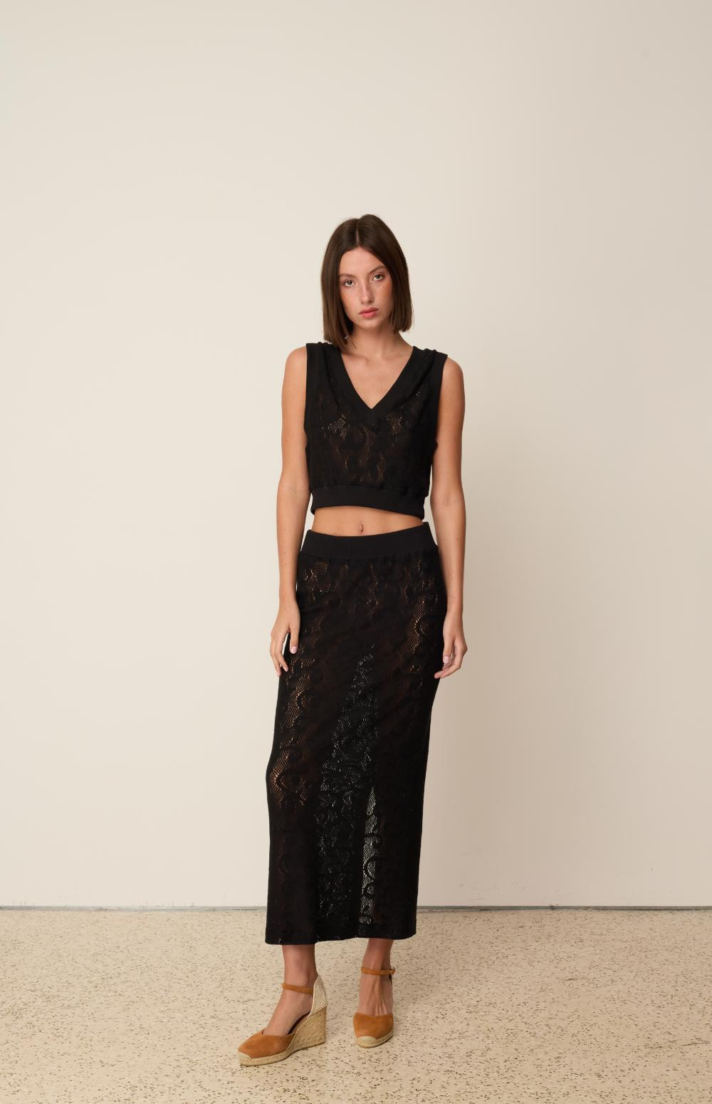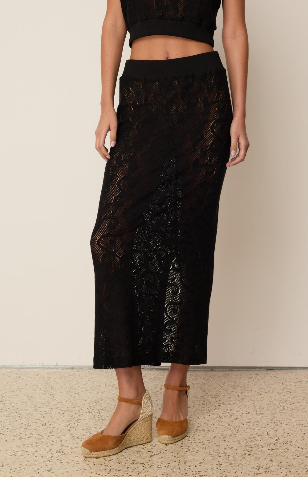 Lace knit skirt with an elastic waistband .