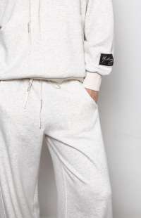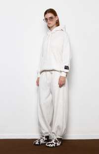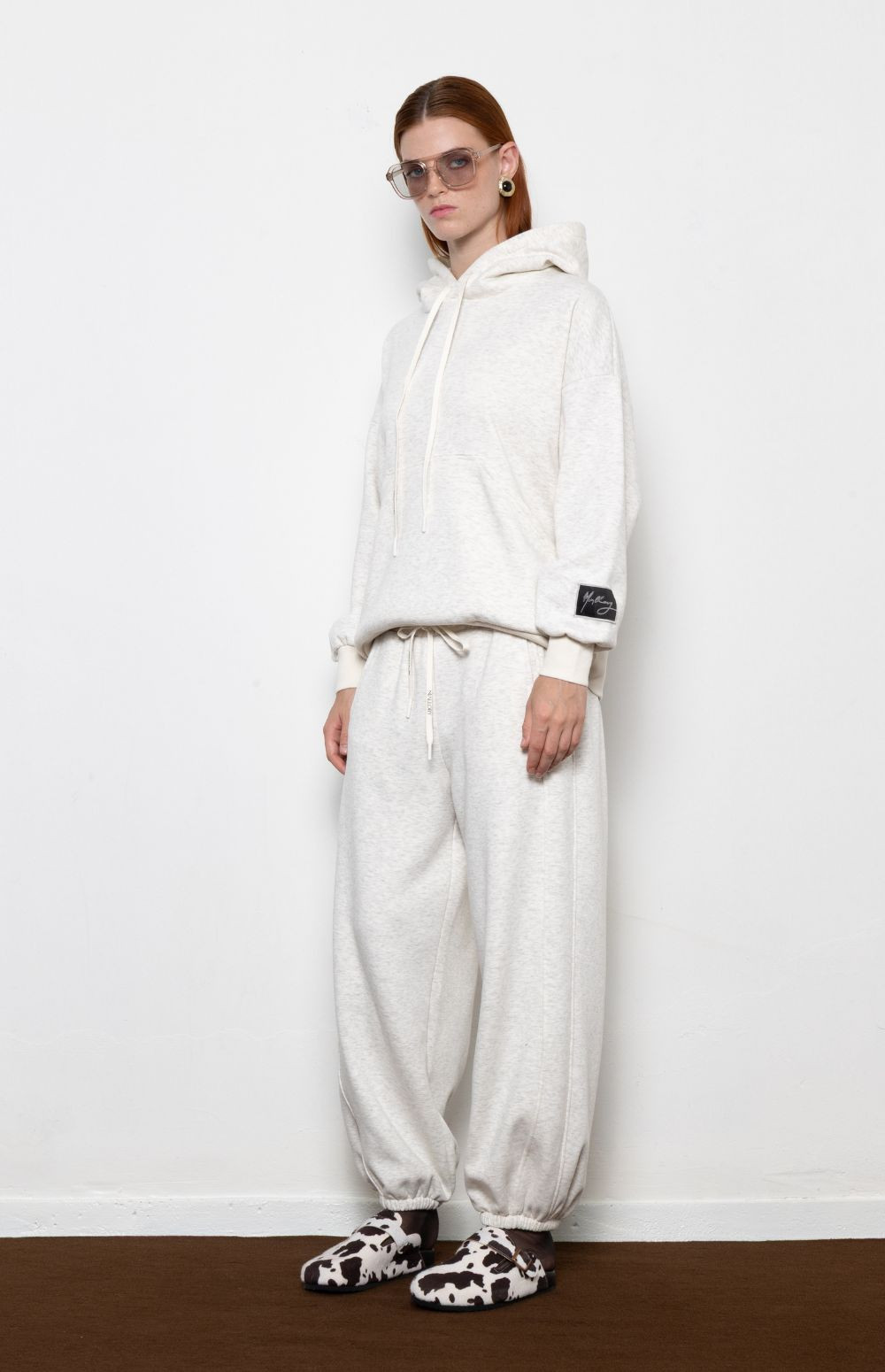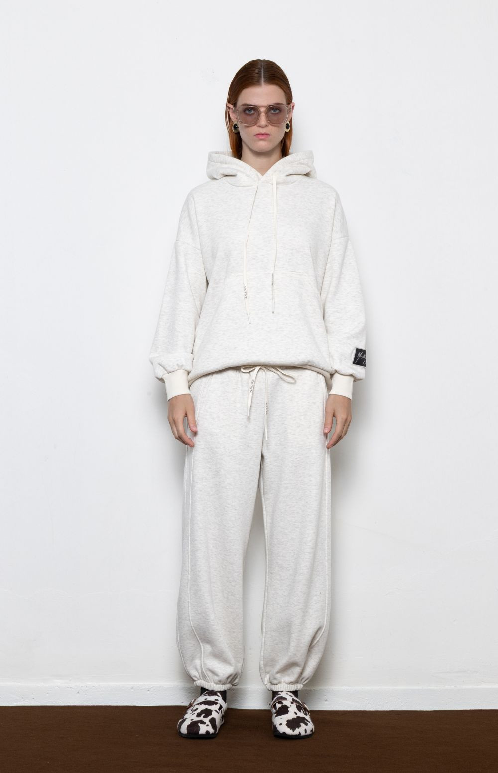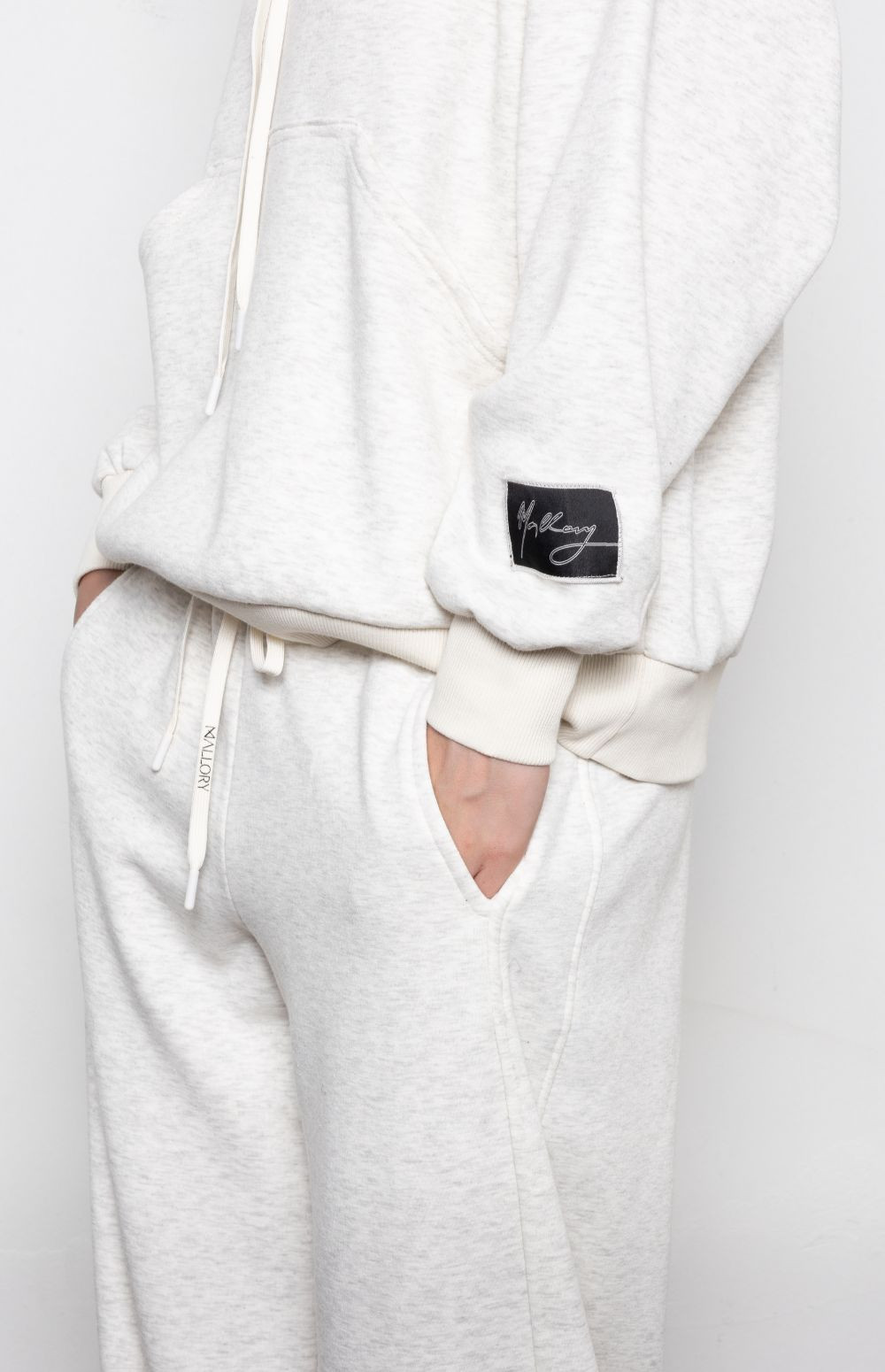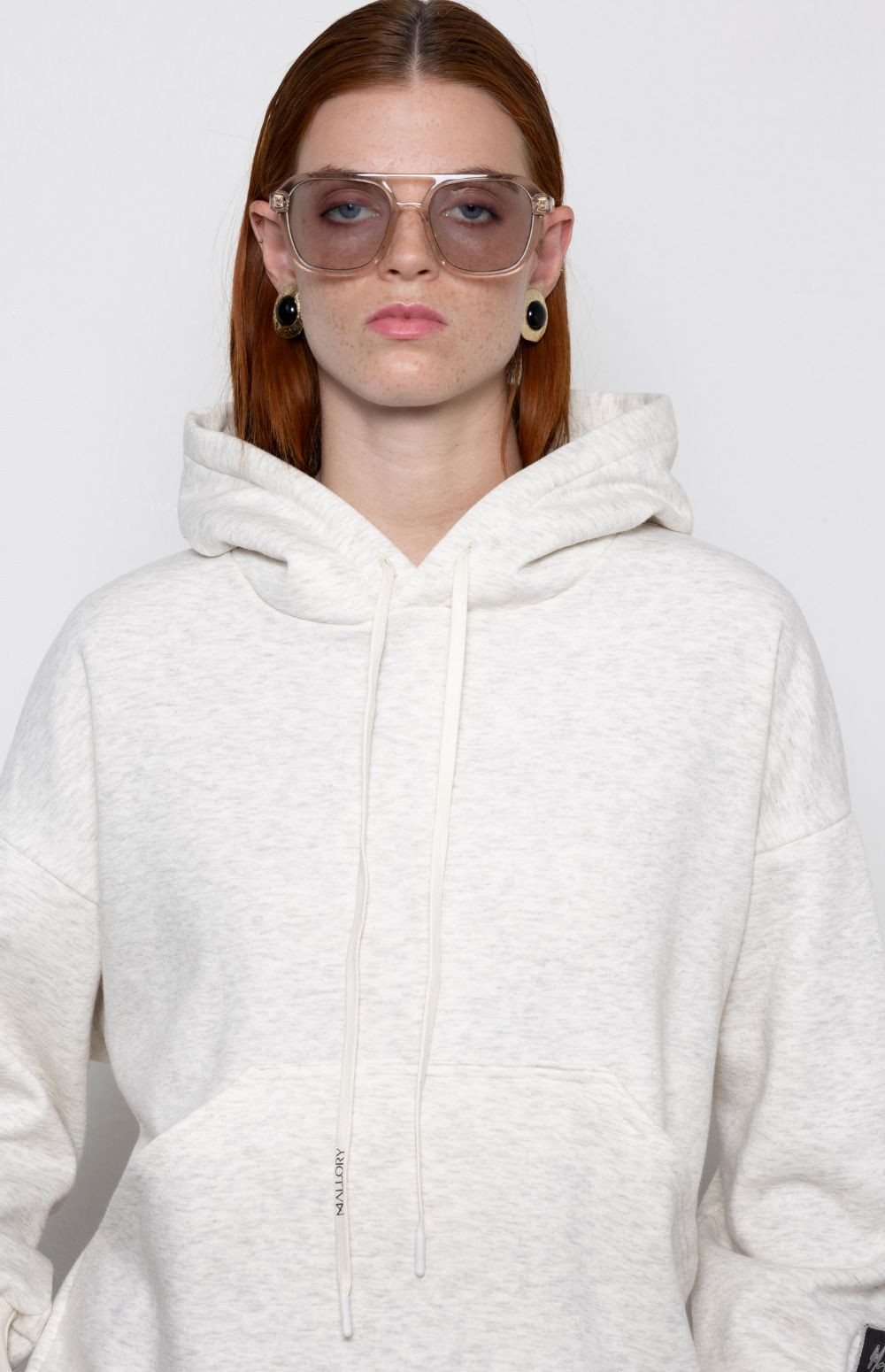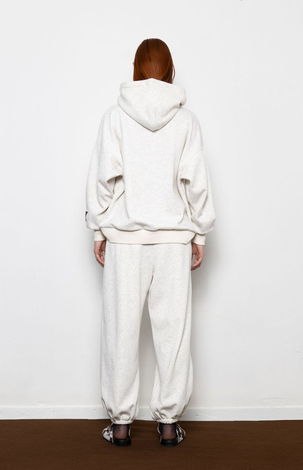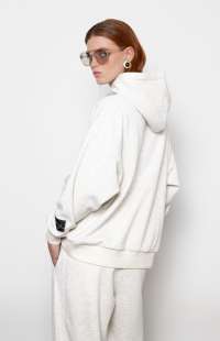 Oversized hoodie in soft melange cream with drawstring hood and logo patch —laid-back, cozy, and effortlessly cool.