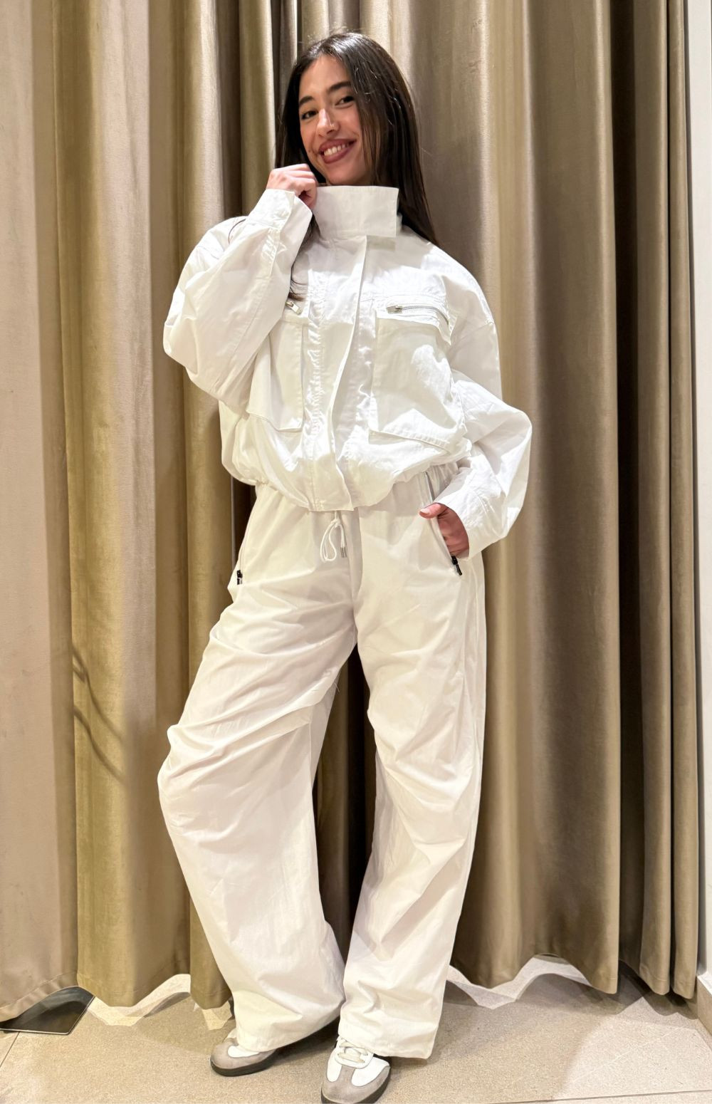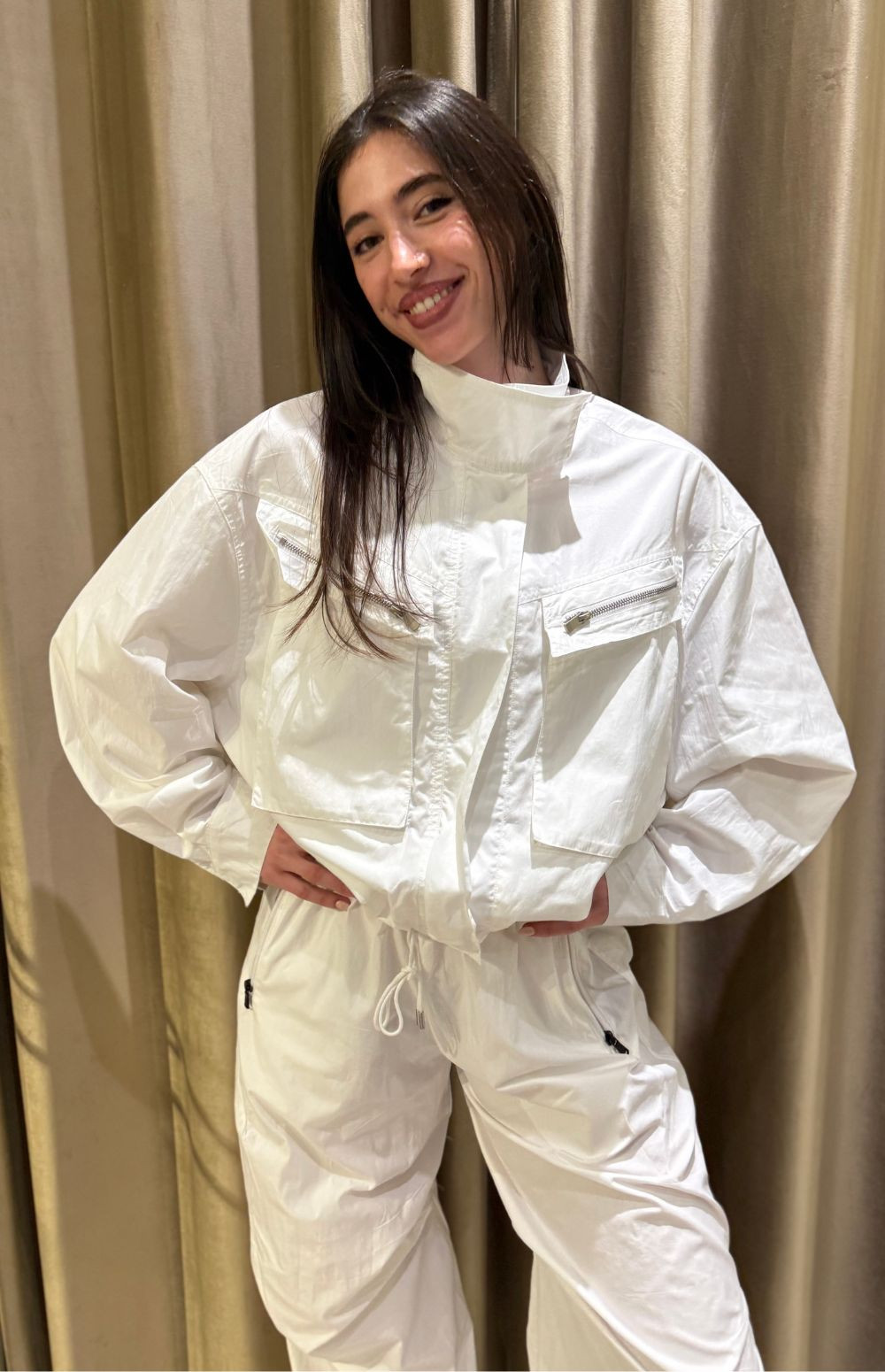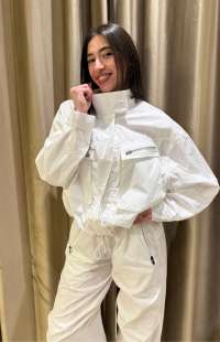 • The Jacket: Features a cropped, oversized fit with an adjustable hem, utility-style zip pockets, and a high-neck collar for a sporty touch.