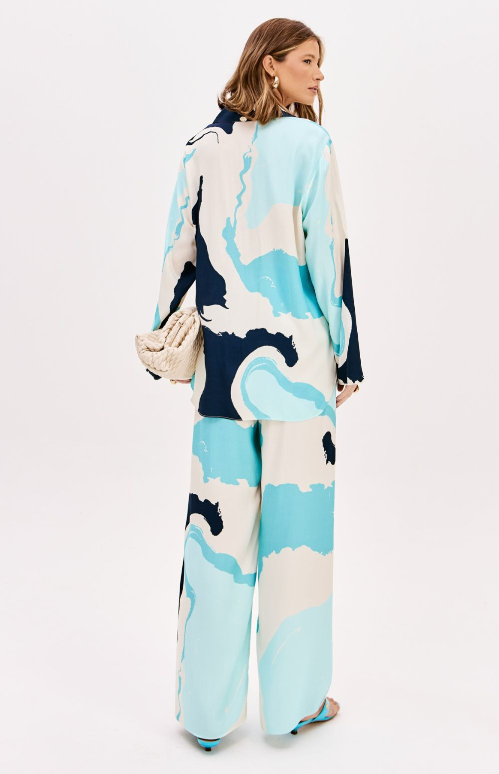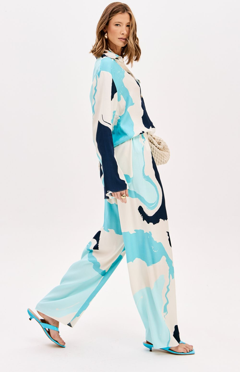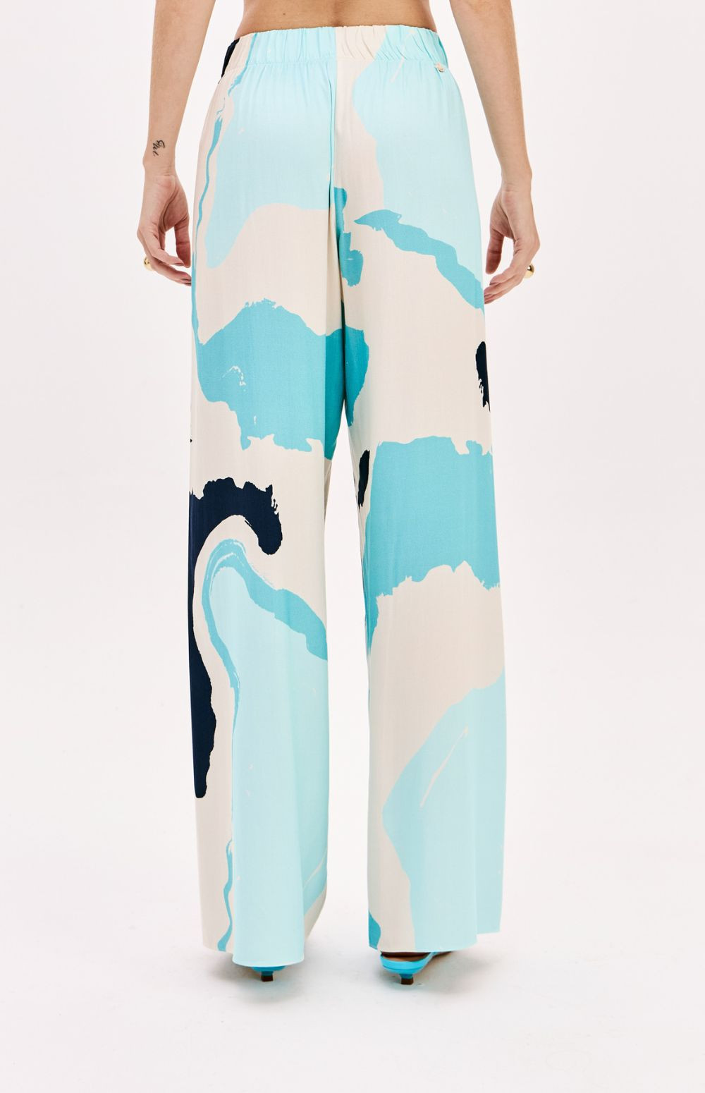 These full-length trousers are made from viscose crepe, a lightweight, flat fabric with a sophisticated feel. Featuring a balanced and comfortable cut, they have a high waist, elasticated waistband, and a striking print.