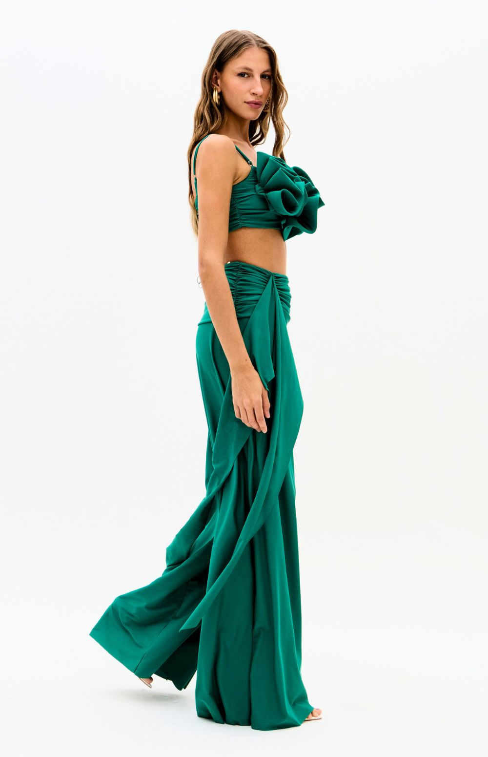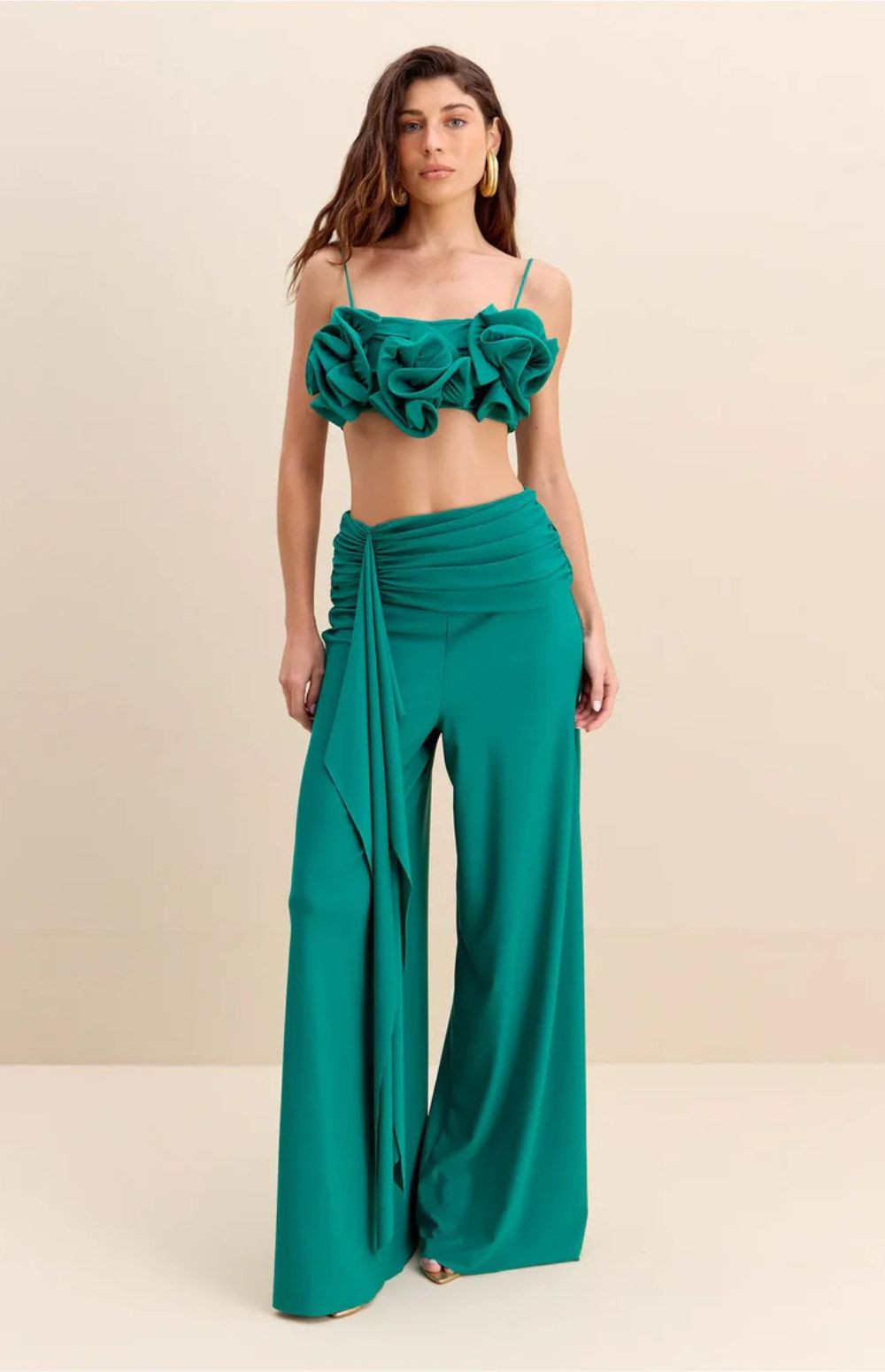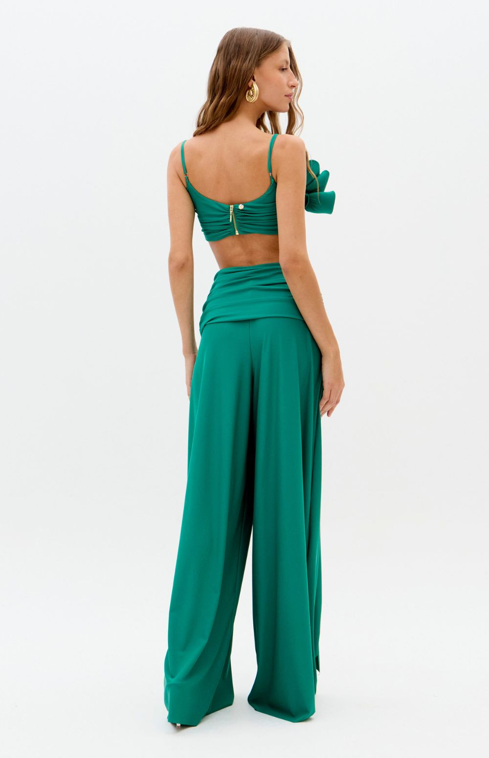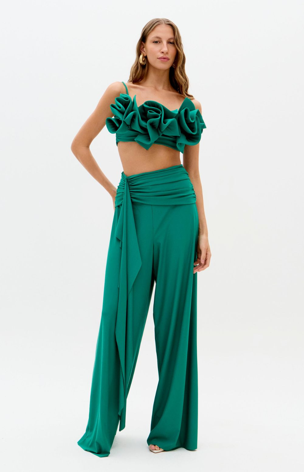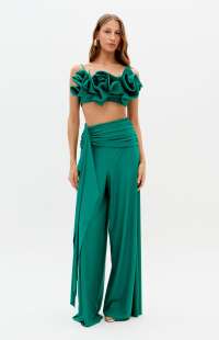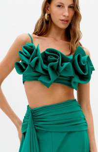 This cropped top, crafted from knit fabric, features a body-hugging fit, thin adjustable straps, and a back zipper closure. The standout detail is the voluminous, structured ruffles that create a striking visual impact and add elegance to the look. A must-have!