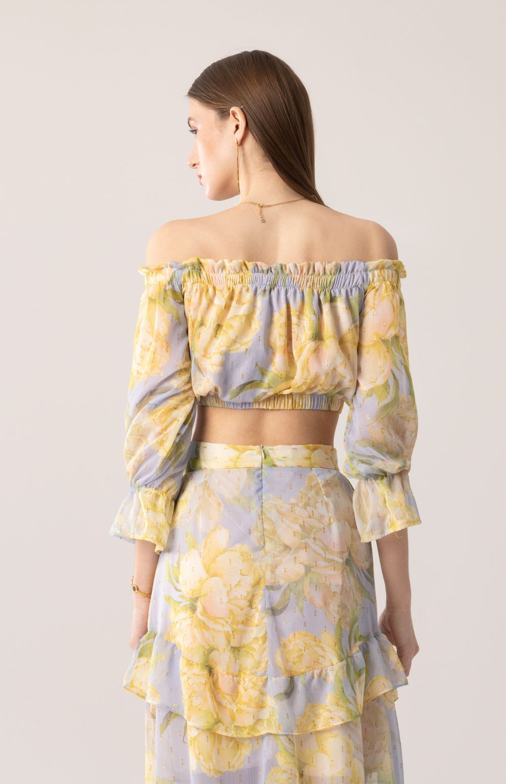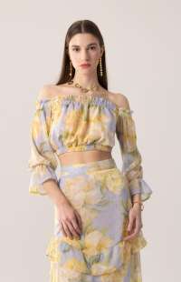 Crop top in a soft powder-blue shade featuring a yellow floral print with subtle gold accents. Designed with an off-shoulder neckline and elasticated trim that gently hugs the shoulders, while the balloon sleeves add romantic movement. A fresh and feminine piece perfect for summer statement styling.