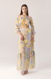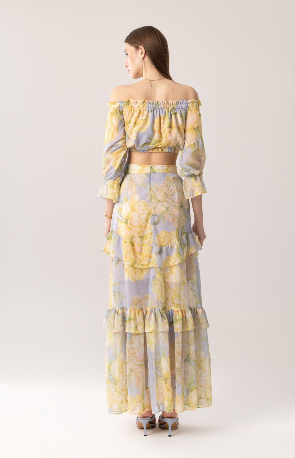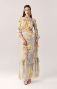 Maxi skirt in a soft powder-blue shade with a yellow floral print and subtle gold accents. Designed with a high-waisted silhouette that enhances the waist and flows into a fluid shape with ruffle details that add movement. A piece full of effortless summer elegance.