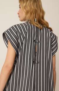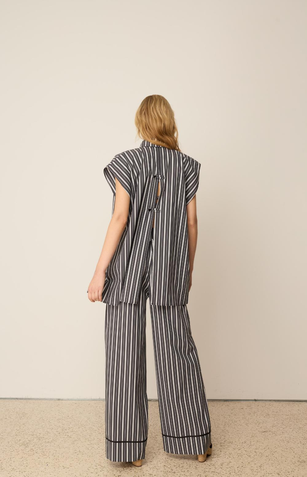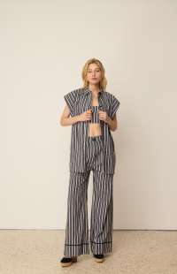 This is the piece you're going to fall in love with this season. In loose line, thin, elegant stripes it has a back slit that closes with buttons, creating a flowy effect and making this piece even more stylish. Wear it with its matching striped pants for maximum style.