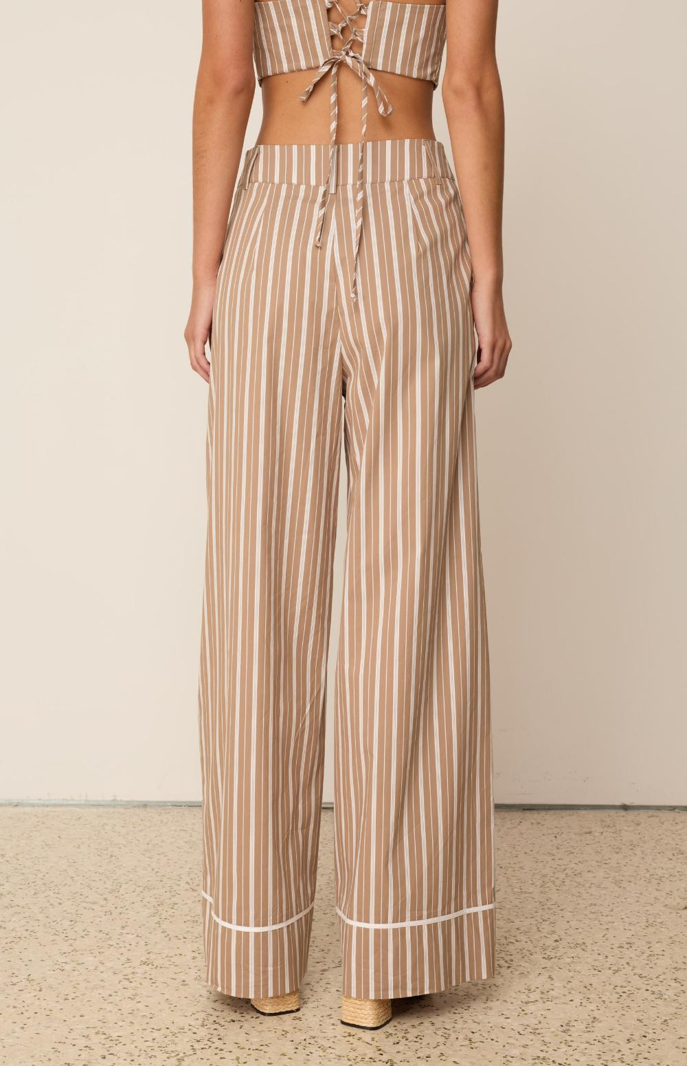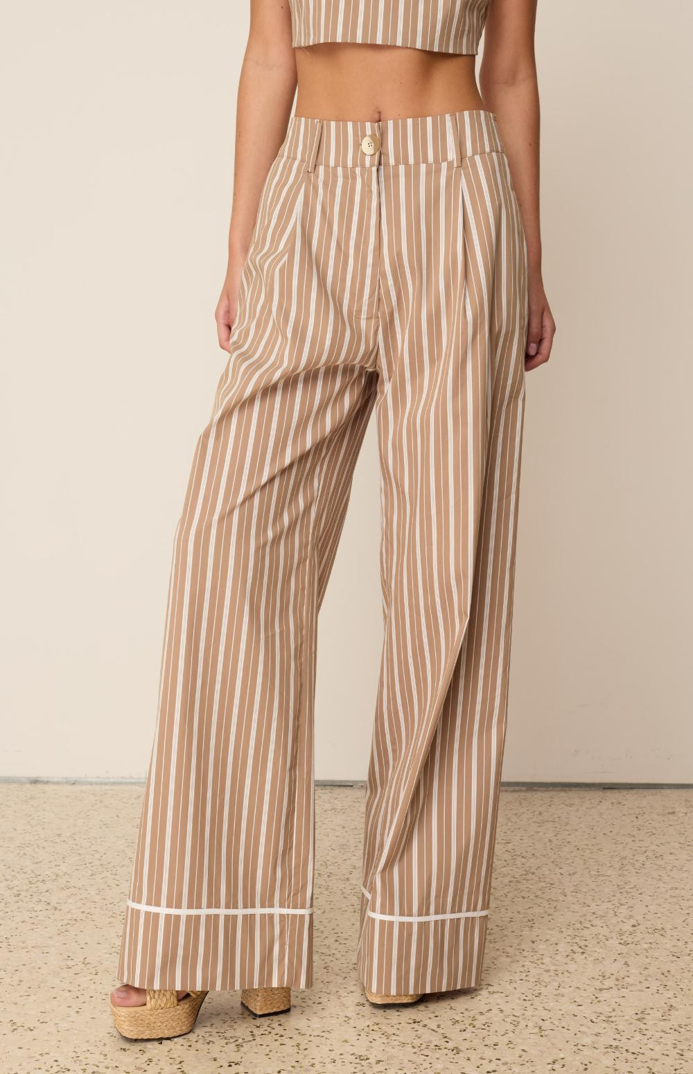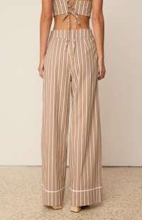 These pants have a wide leg and lapel-style detail. They have stylish stripes and a high-waisted design for a flattering fit.