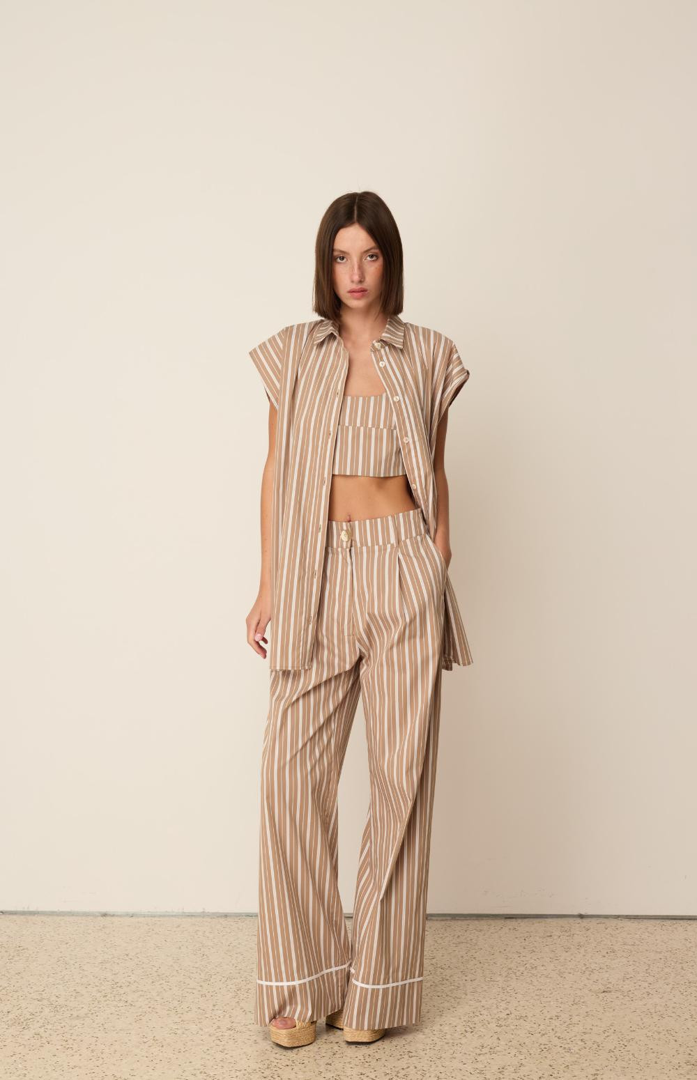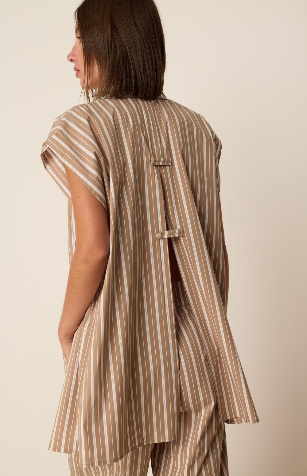 This is the piece you're going to fall in love with this season. In loose line, thin, elegant stripes it has a back slit that closes with buttons, creating a flowy effect and making this piece even more stylish.