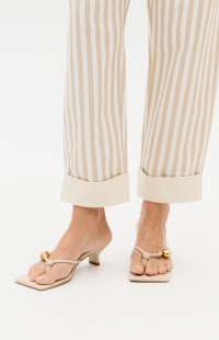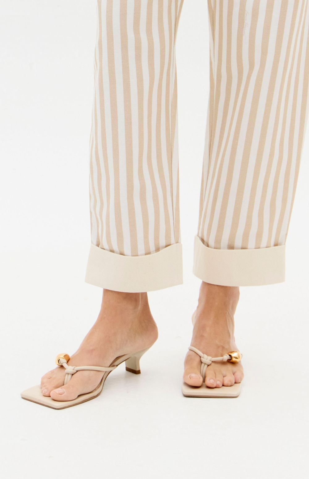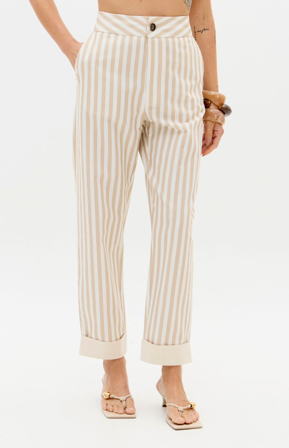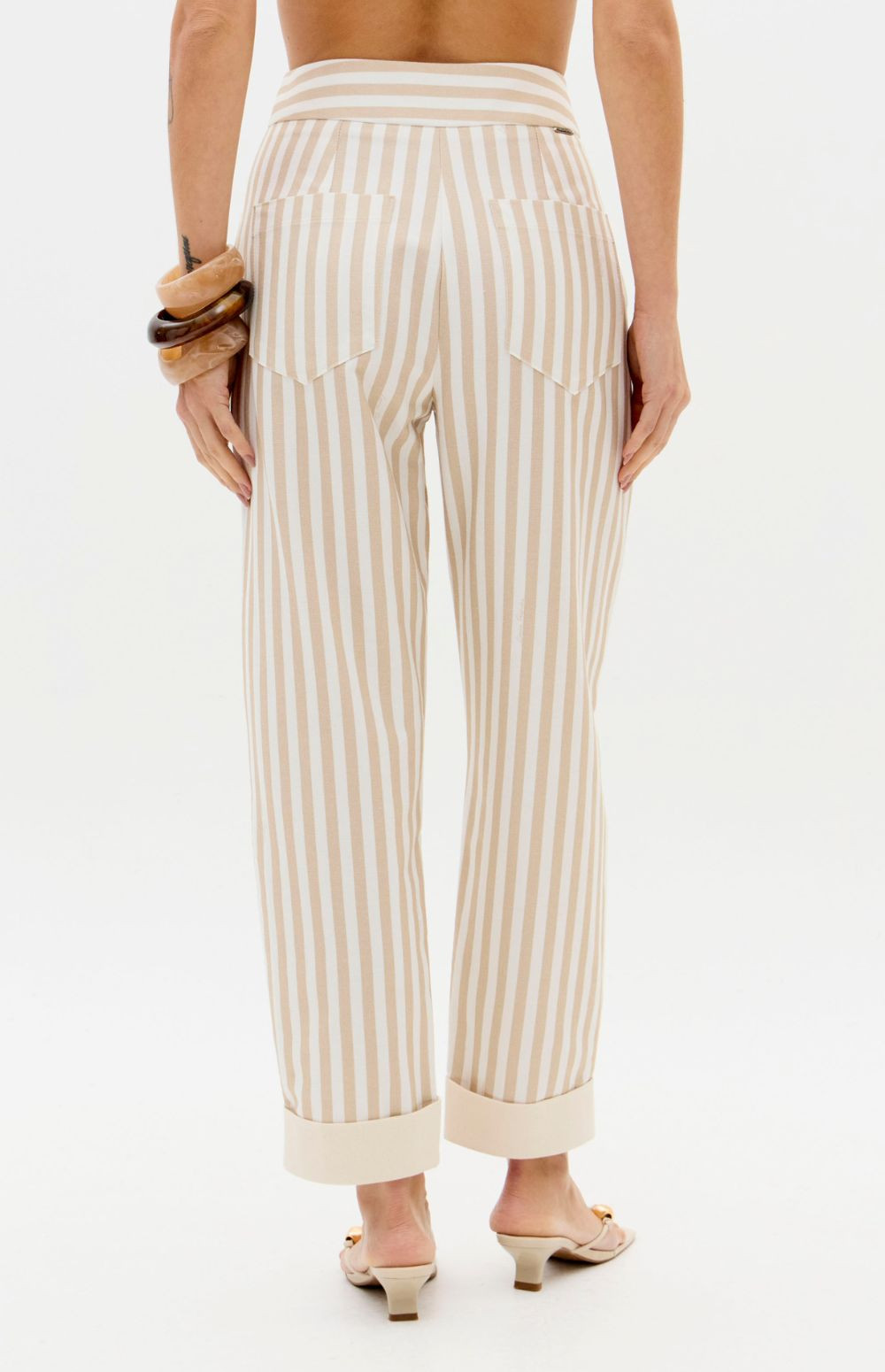 These structured, baggy-style trousers feature a wider hip and slightly tapered legs. They have a high waist, functional pockets, a button and zipper closure, and Italian-style cuffs that complete the look. A sure bet for the season!