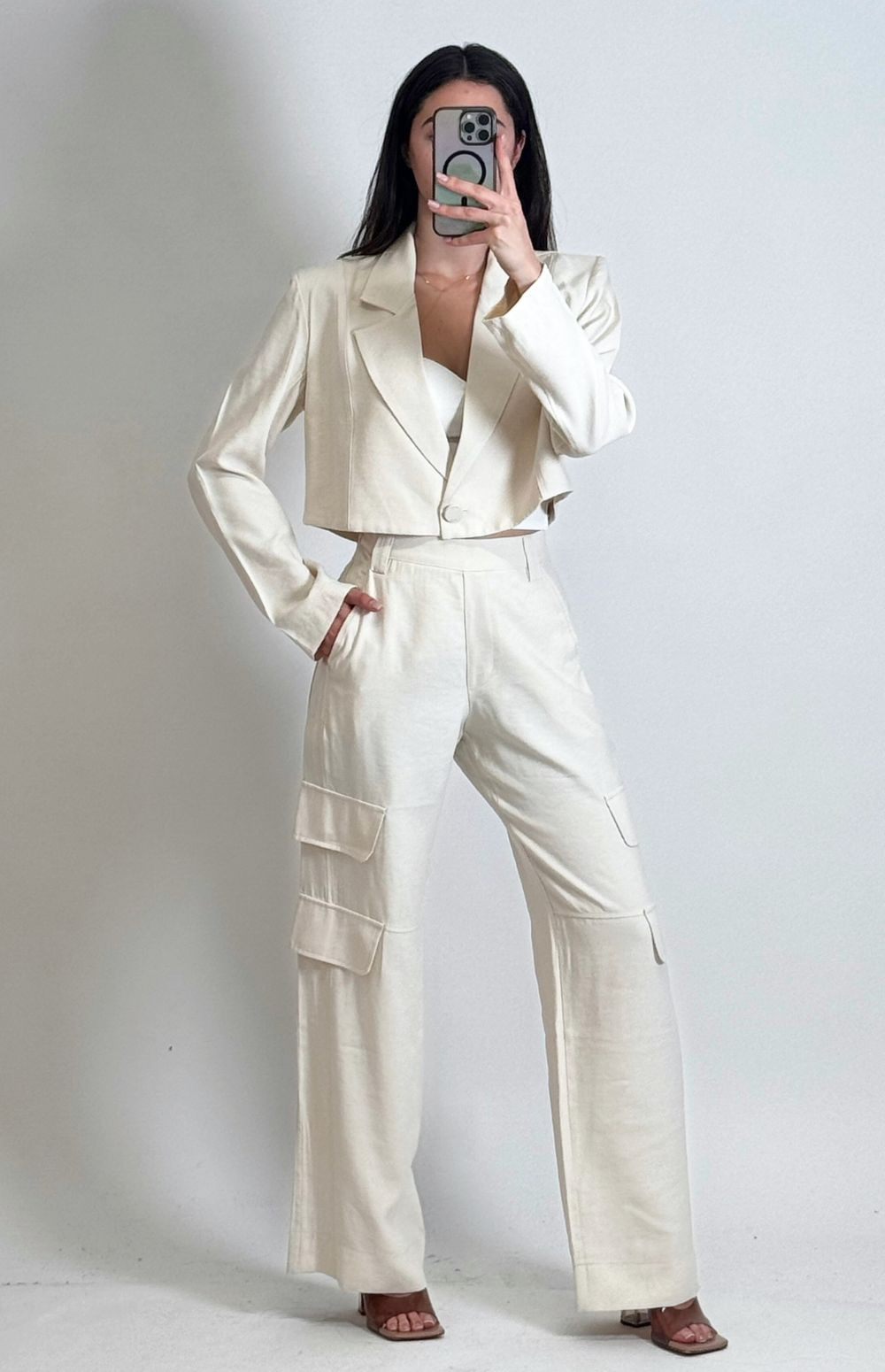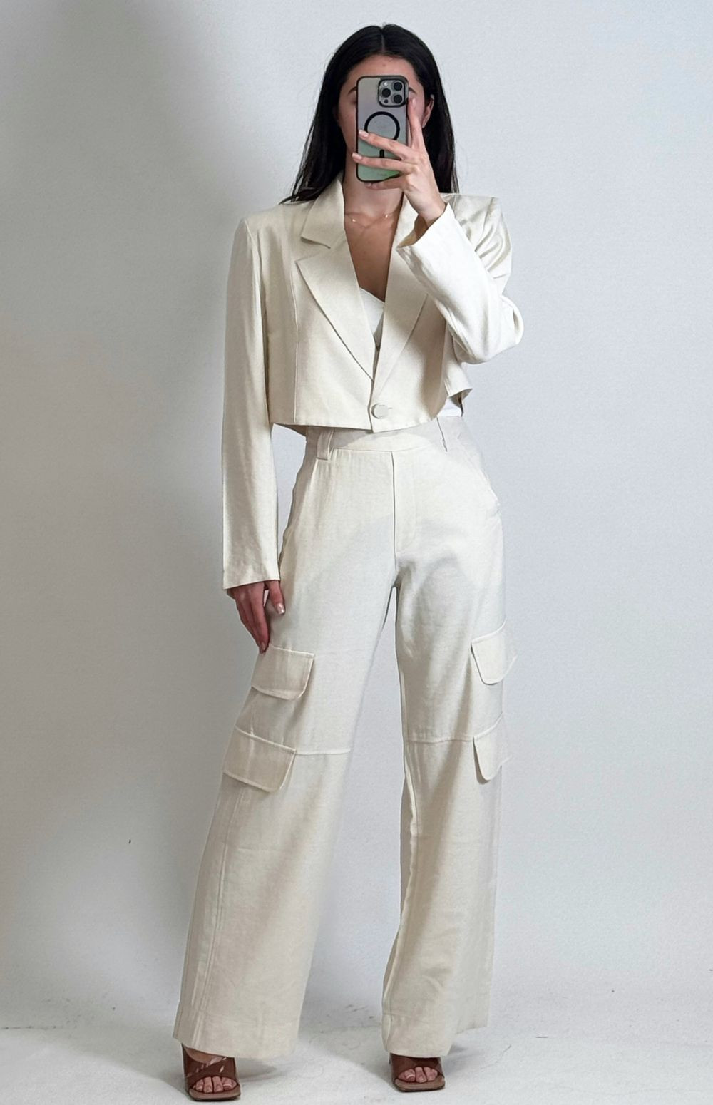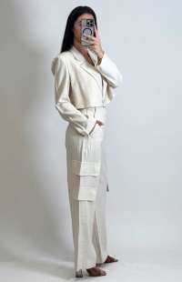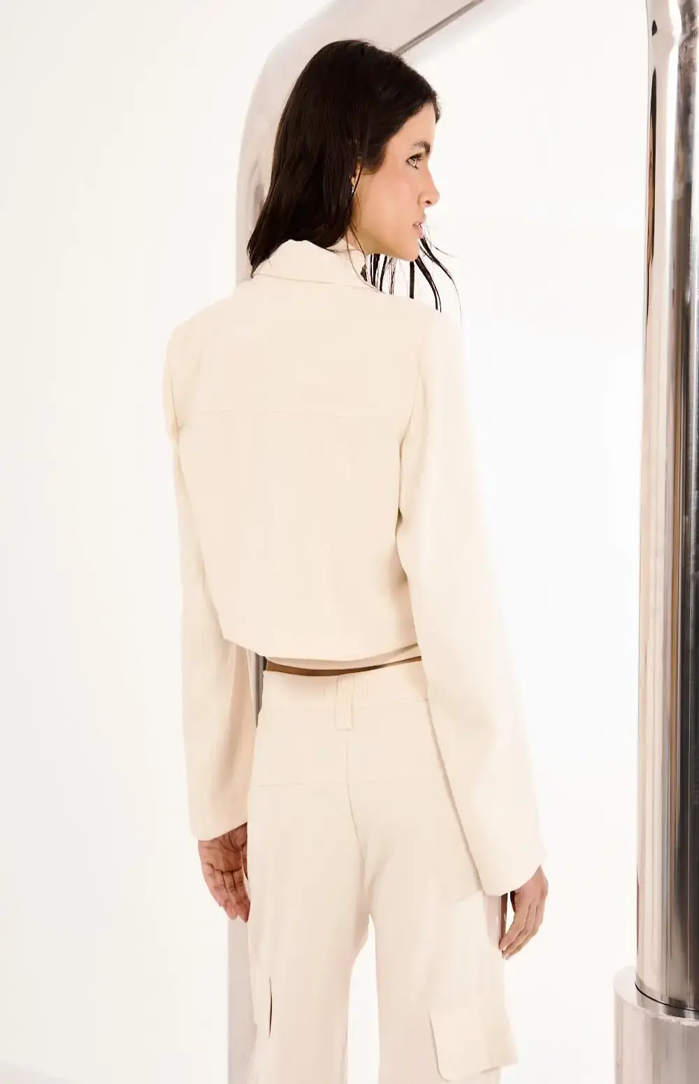 Blazer with a cropped fit (very short, ending above the waist), straight and structured cut. Features a classic tailored collar with lapels, long sleeves, and a front closure with a single center button.