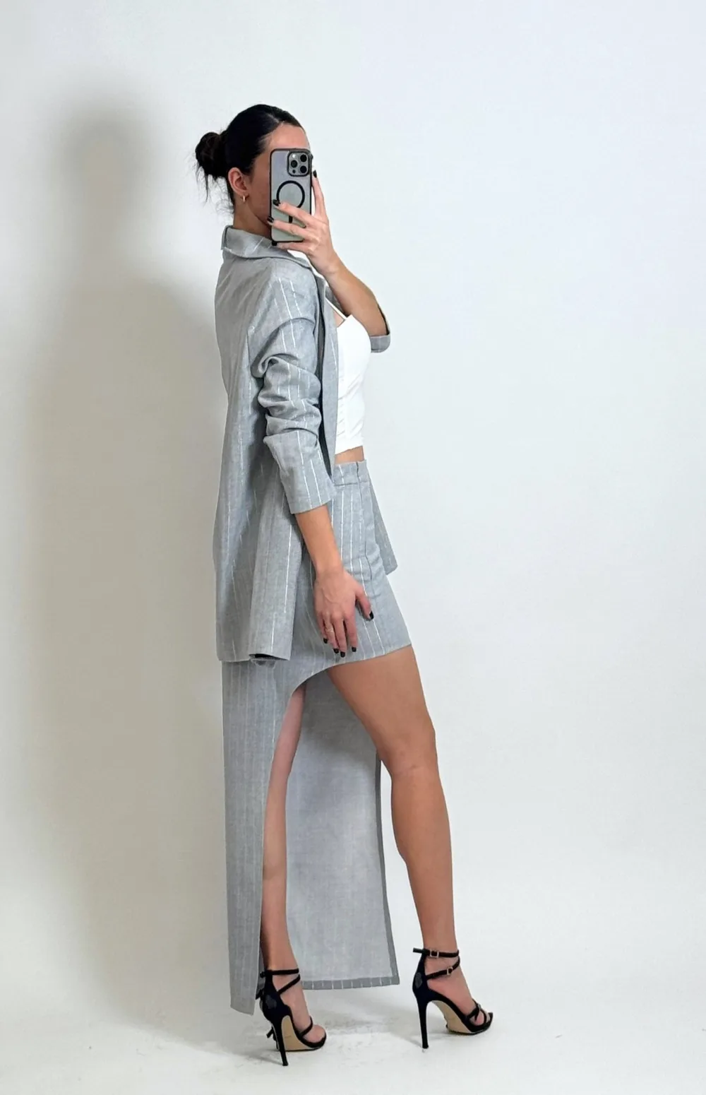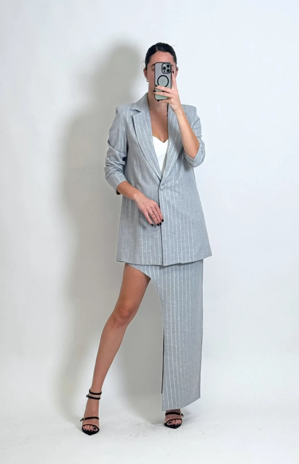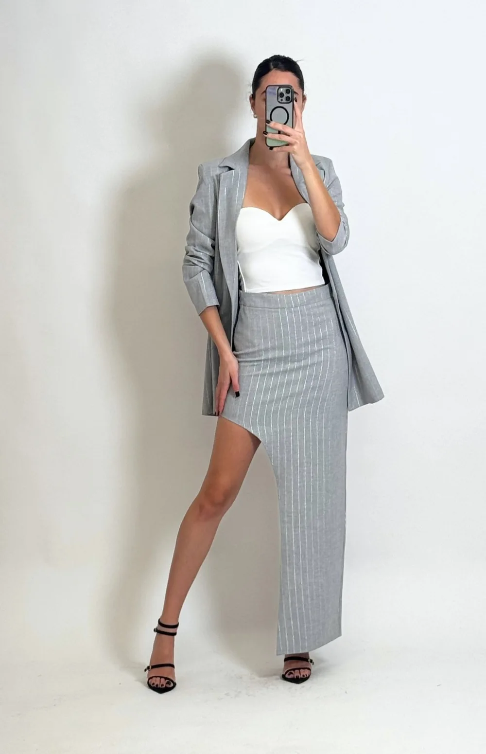 Oversized tailored blazer, lined, with an imposing fit and refined finish & The super midi skirt with a mid-rise and asymmetrical fit is the perfect choice for those looking to break away from the ordinary with elegance. The pinstripe pattern brings a fresh, tailored vibe, while the unique cut elongates the silhouette and adds personality to the look.