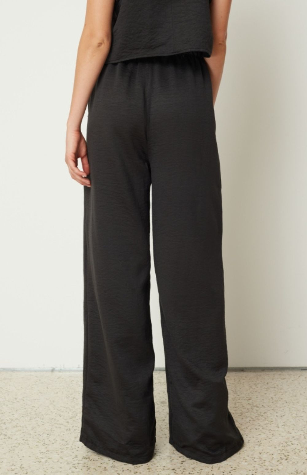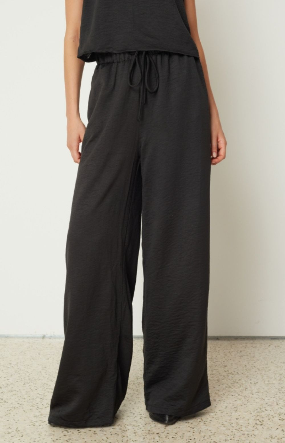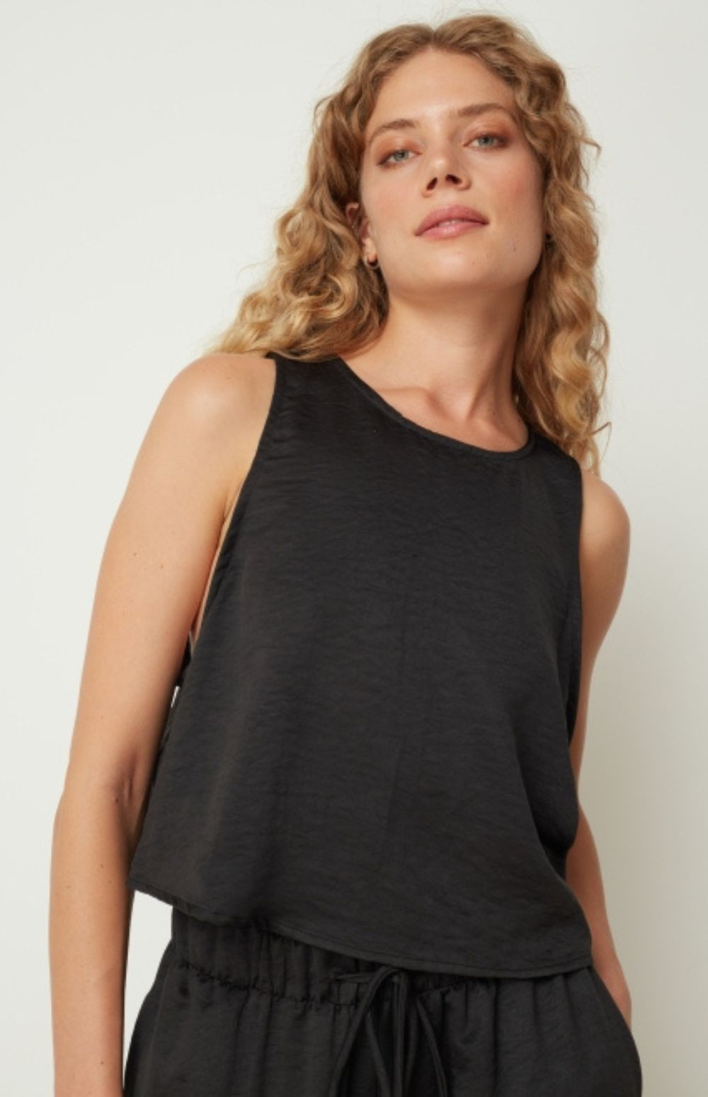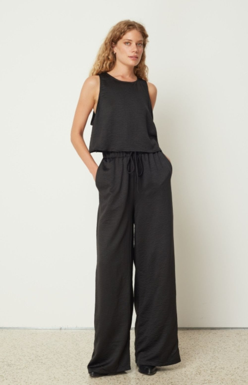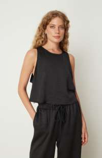 Sleeveless top with a round neckline and side slits & Jogger pants with side pockets. Elastic waistband adjustable with drawstrings.