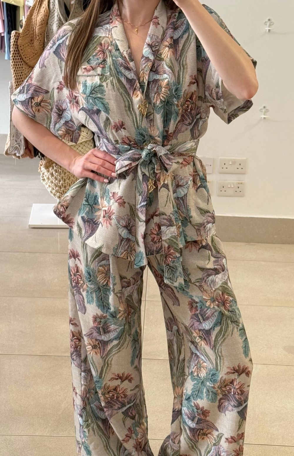 Short sleeve blazer with heart-shaped pin closures at the front and matching fabric belt.