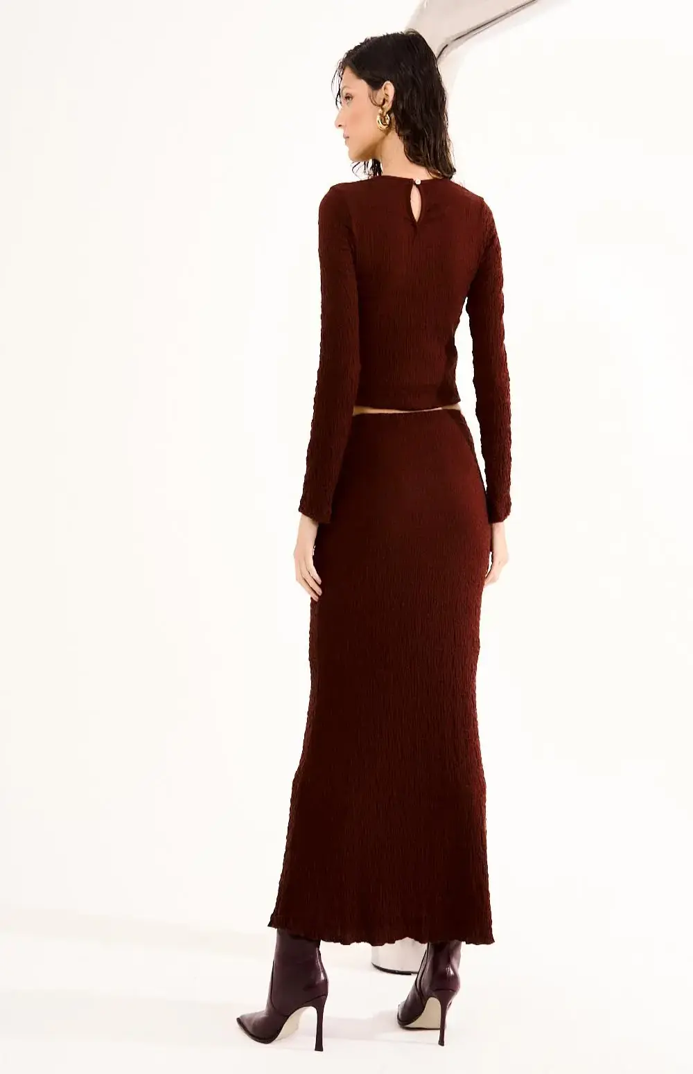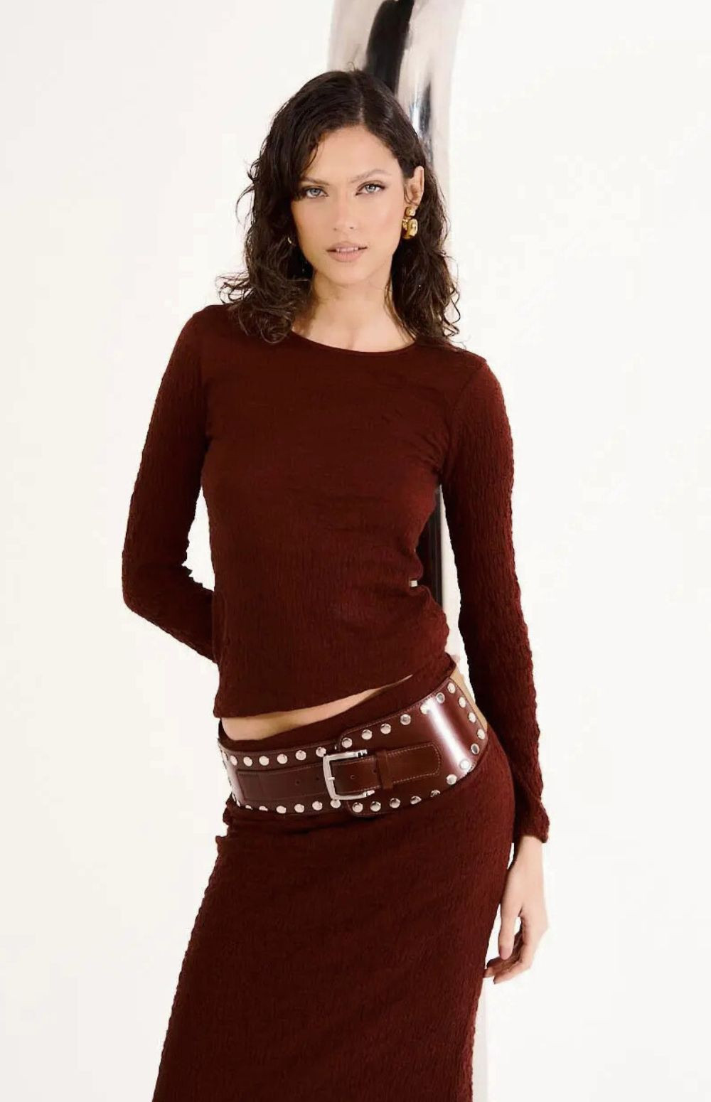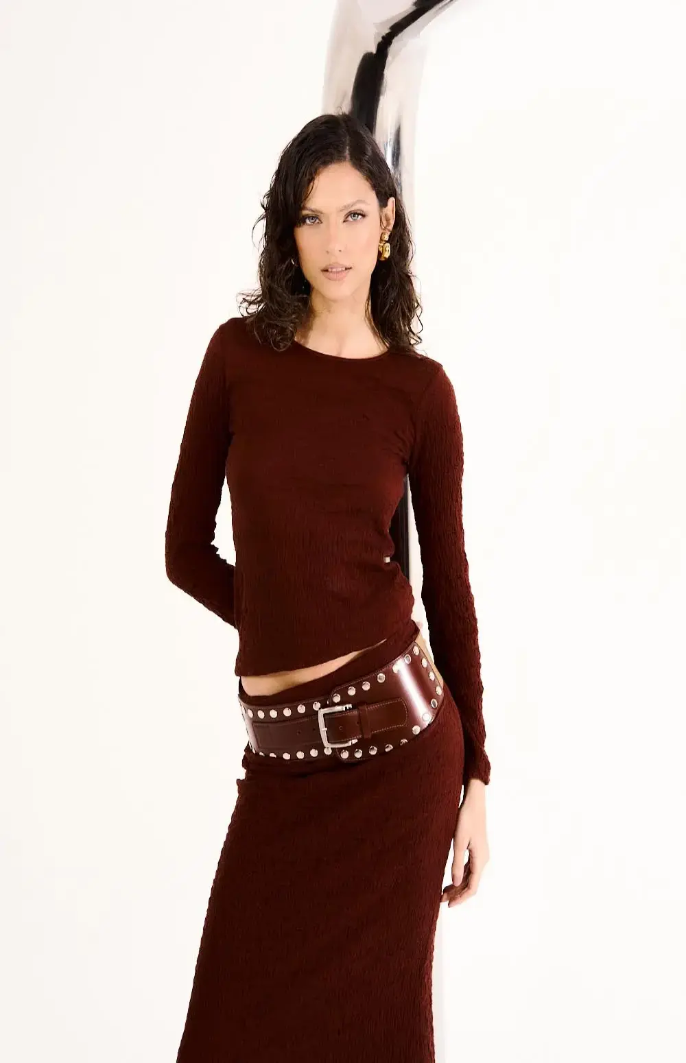 Sophistication meets texture in this Long Sleeve Top, a body-hugging piece with elegance and a rebellious touch. Its textured knit and minimalist design create a powerful and feminine look, perfect for creating striking ensembles or worn alone with other pieces.