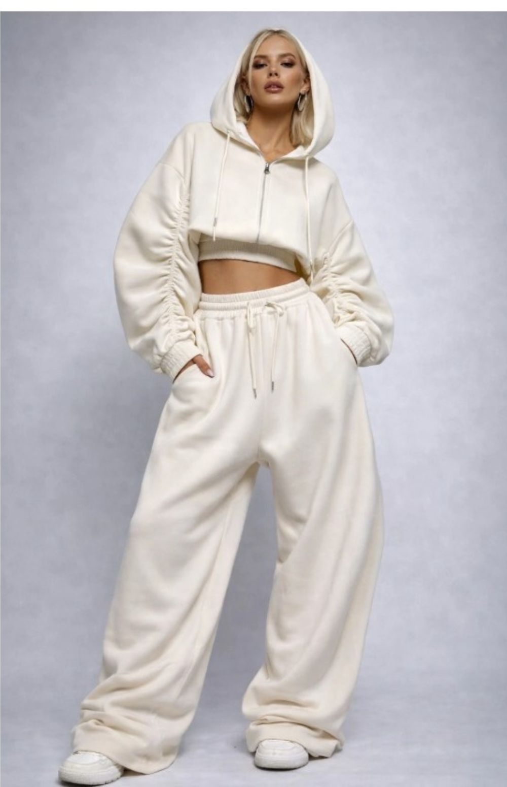 Cropped Zip Hoodie: Features a contemporary boxy fit, an adjustable drawstring hood, and unique ruched detailing along the oversized sleeves.