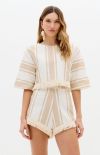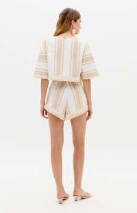 This printed cropped blouse is made from a structured woven fabric with short sleeves, a round neckline, and a loose fit. The special detail is the fringed hem, which reinforces the handcrafted appeal and ensures a striking finish to any outfit.