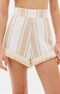 Made from a structured, non-stretch woven fabric, these hot pants feature a high waist, a close-fitting silhouette, and a zipper closure. The fringe detailing at the hem adds texture and movement to the look.