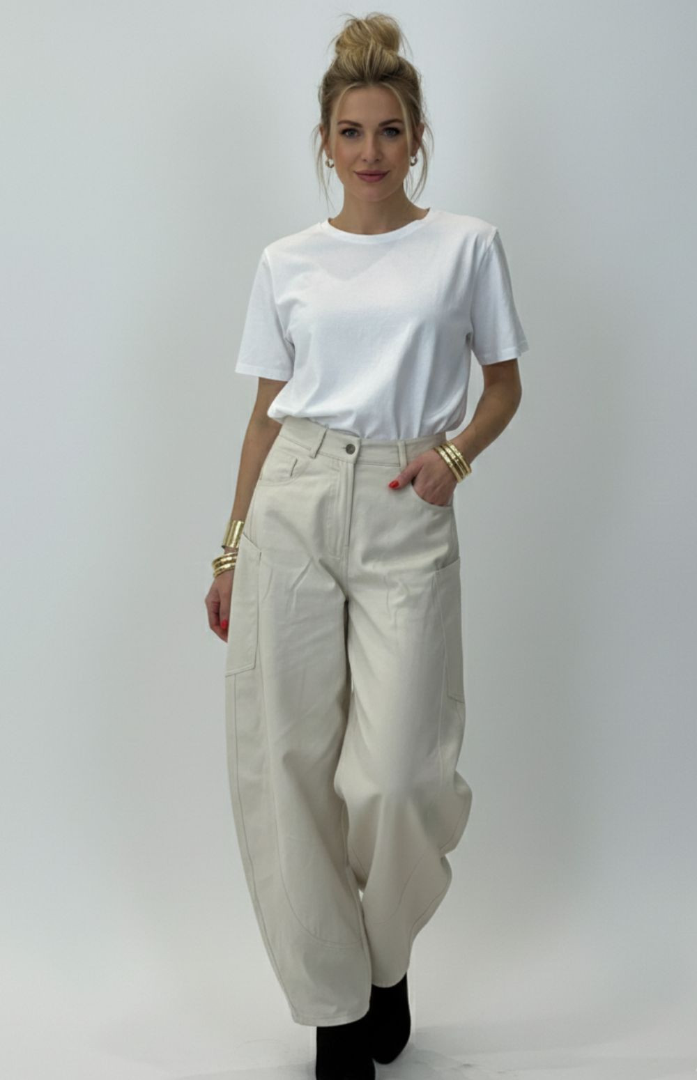 Modern ecru cargo pants in a Barrel fit that combines comfort and style. It features a high waist and a wide, airy leg line that creates a relaxed yet fashion-forward silhouette. The characteristic cargo pockets add utility detail and practicality, while the sturdy fabric ensures comfort and durability in everyday use. Ideal for casual chic looks, it can be worn with cropped tops, sweaters or chunky sneakers for a modern urban look.