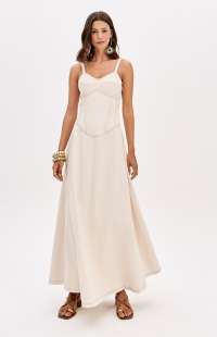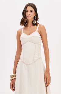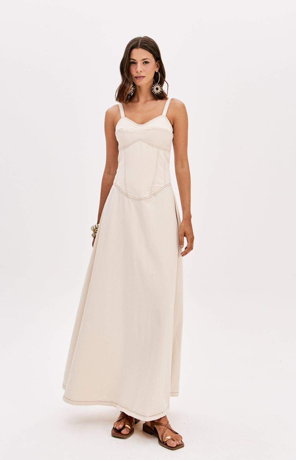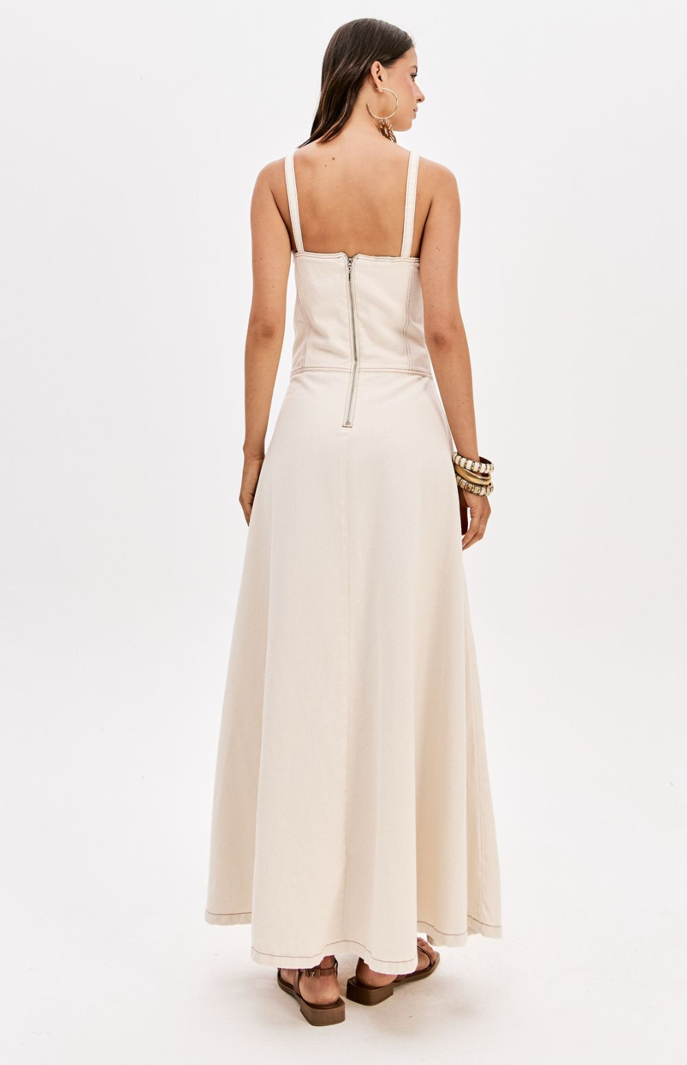 Made from structured denim fabric with an A-line skirt. The design is marked by a corset-style bust with a sweetheart neckline and wide straps. The main detail is the contrasting topstitching that outlines the corset lines at the bust and waist, adding structure, defining the silhouette, and giving it a handcrafted yet vintage touch. The skirt is slightly flared, with a midi length.