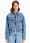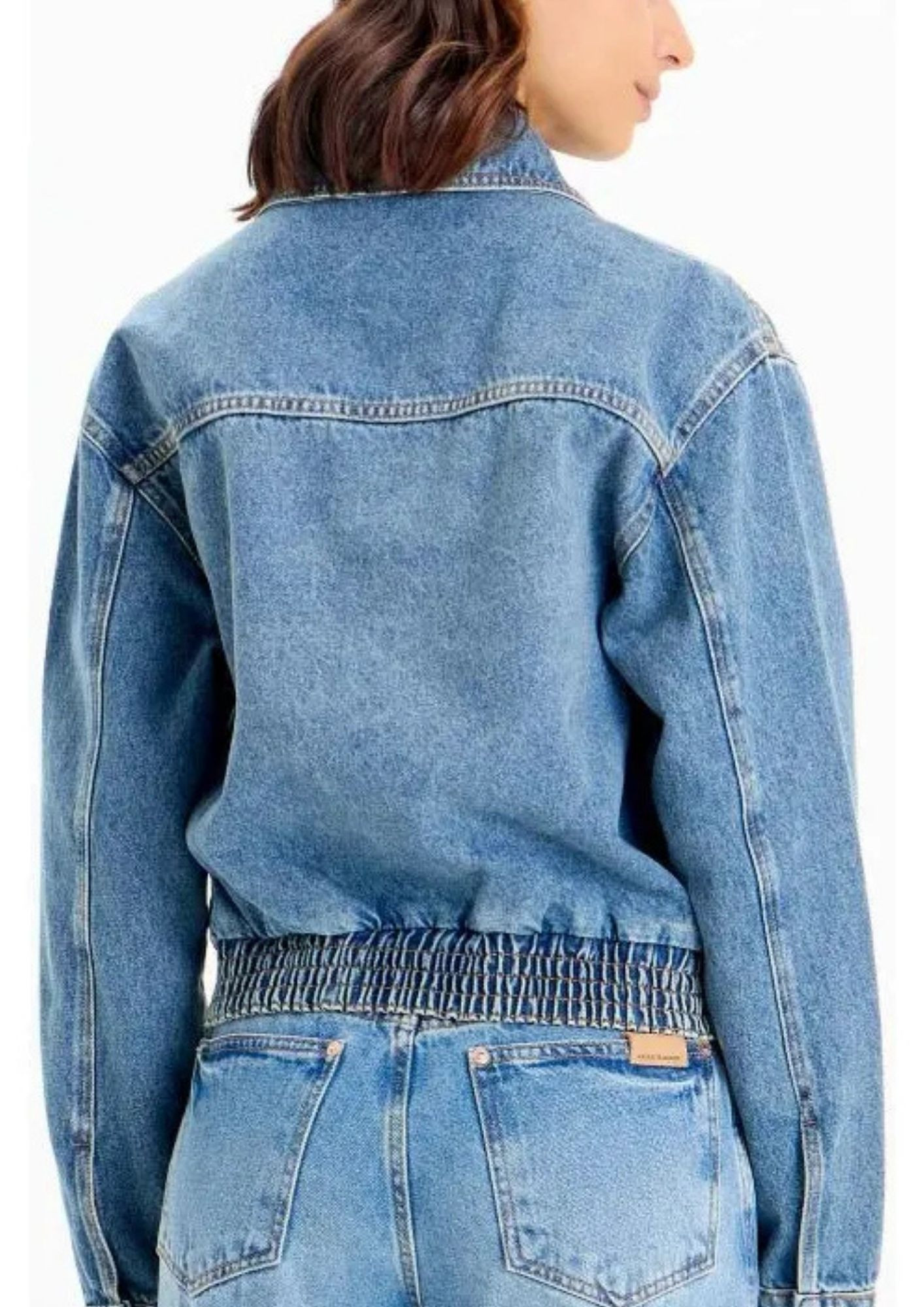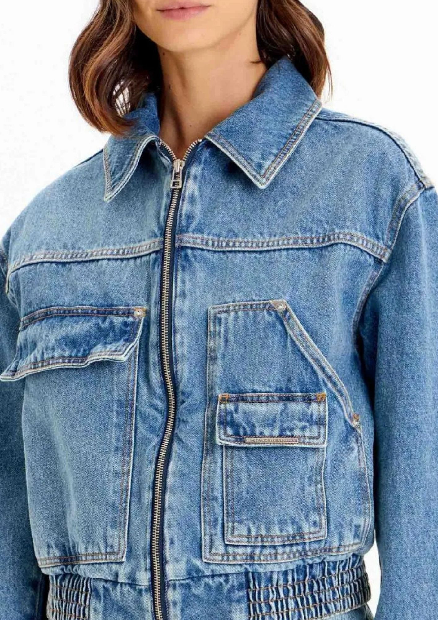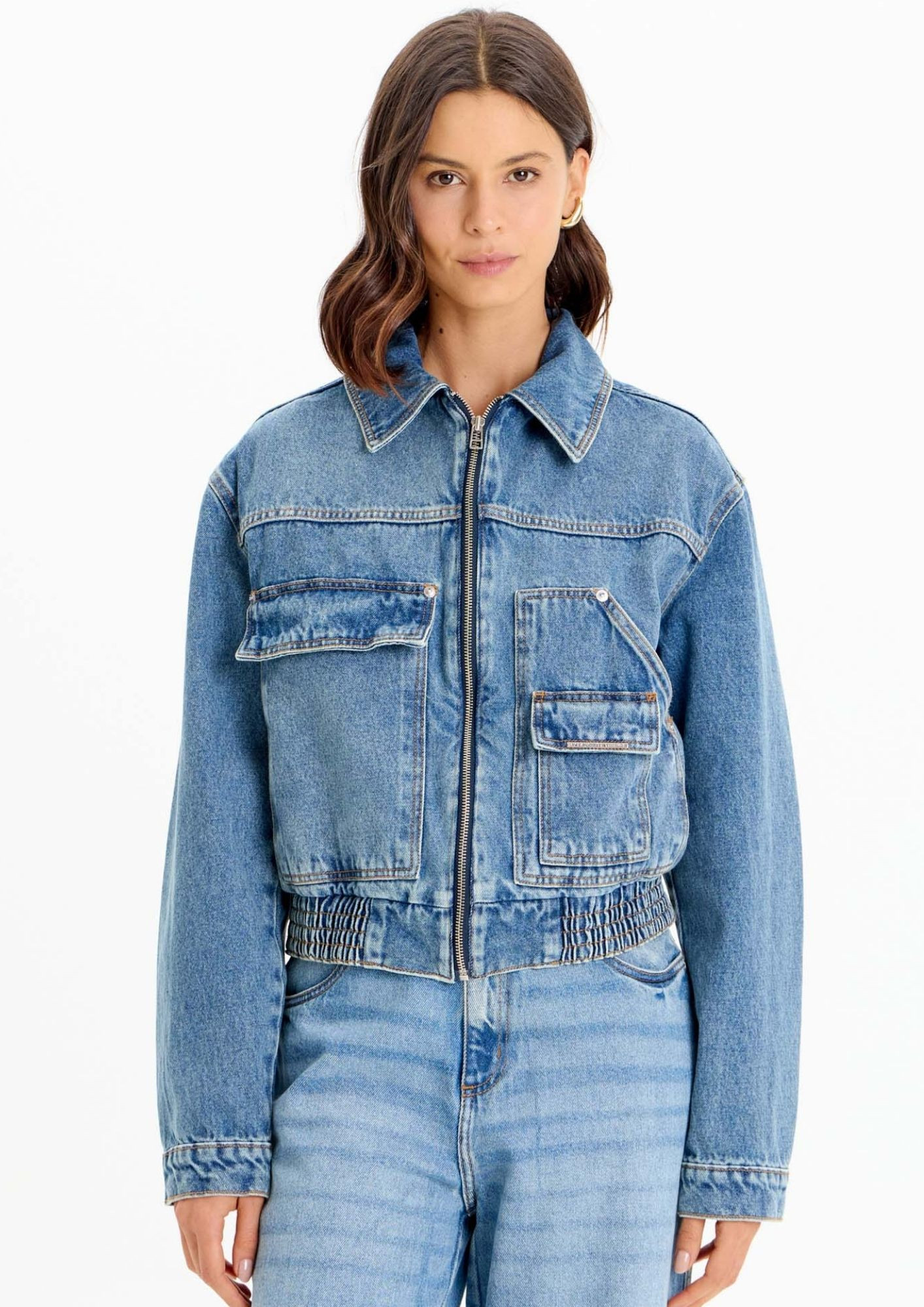 The denim jacket features stonewashed denim with a structured shape, striking utility pockets, and an elastic waistband that perfectly cinches the waist. The front zipper closure and topstitching reinforce the urban vibe. The perfect combination of classic denim and a cool, season-changing aesthetic.