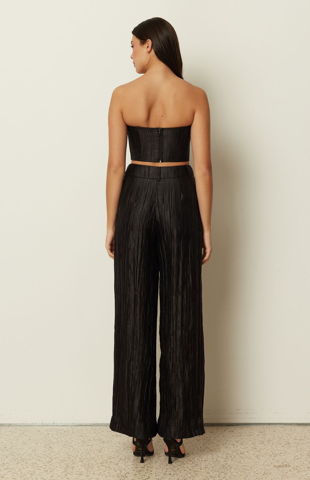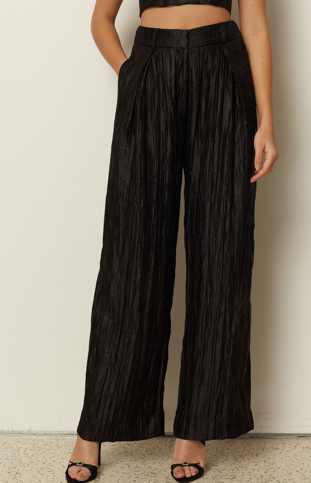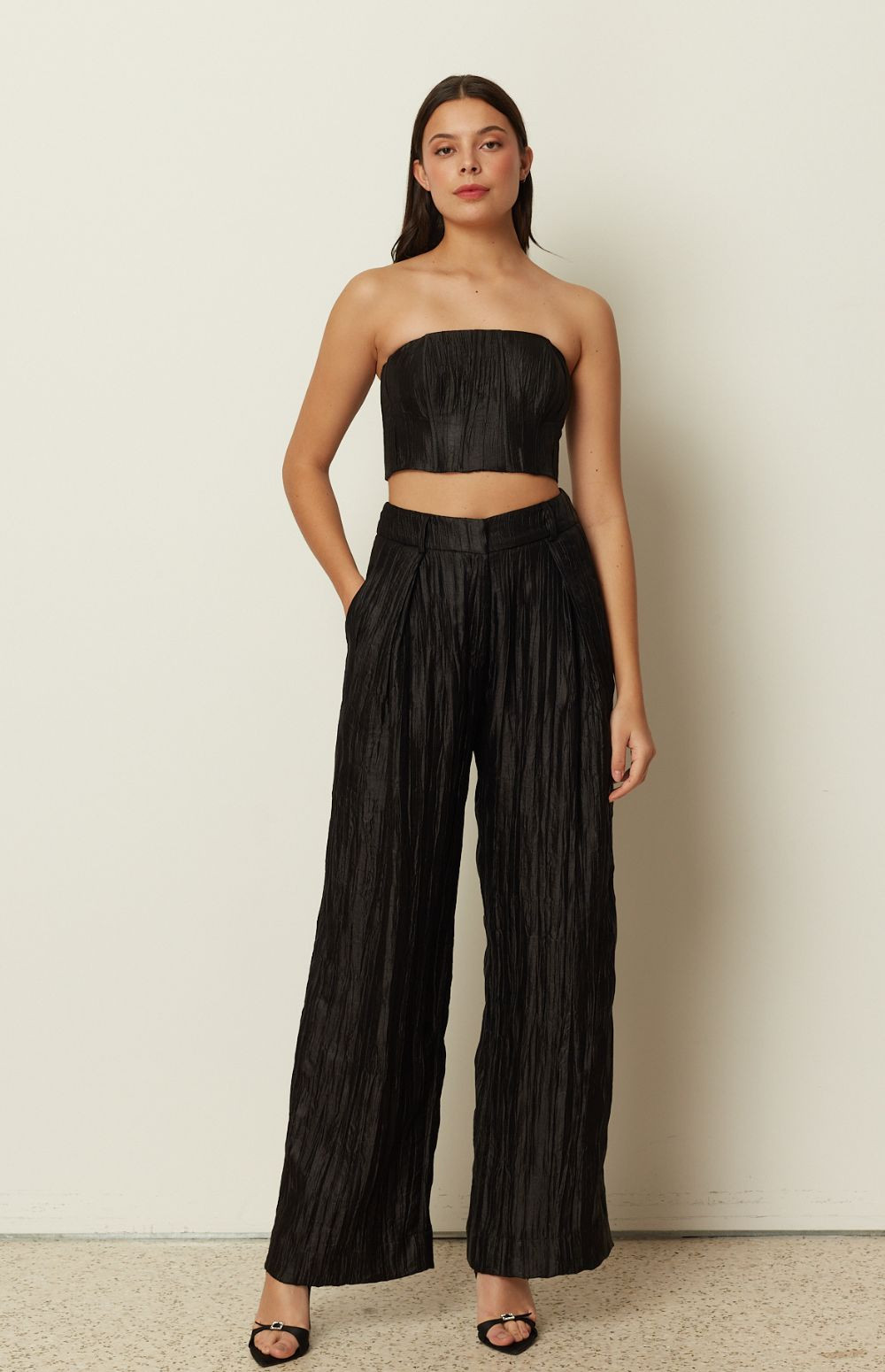 A polished statement piece by ckontova, these high-waisted pleated pants feature a fluid wide-leg silhouette and a luminous textured finish that moves beautifully with every step. Designed with front pleats and side pockets for an effortless fit, they pair perfectly with the matching vest and bustier for elevated evening dressing or with a simple tank for modern day-to-night style.
