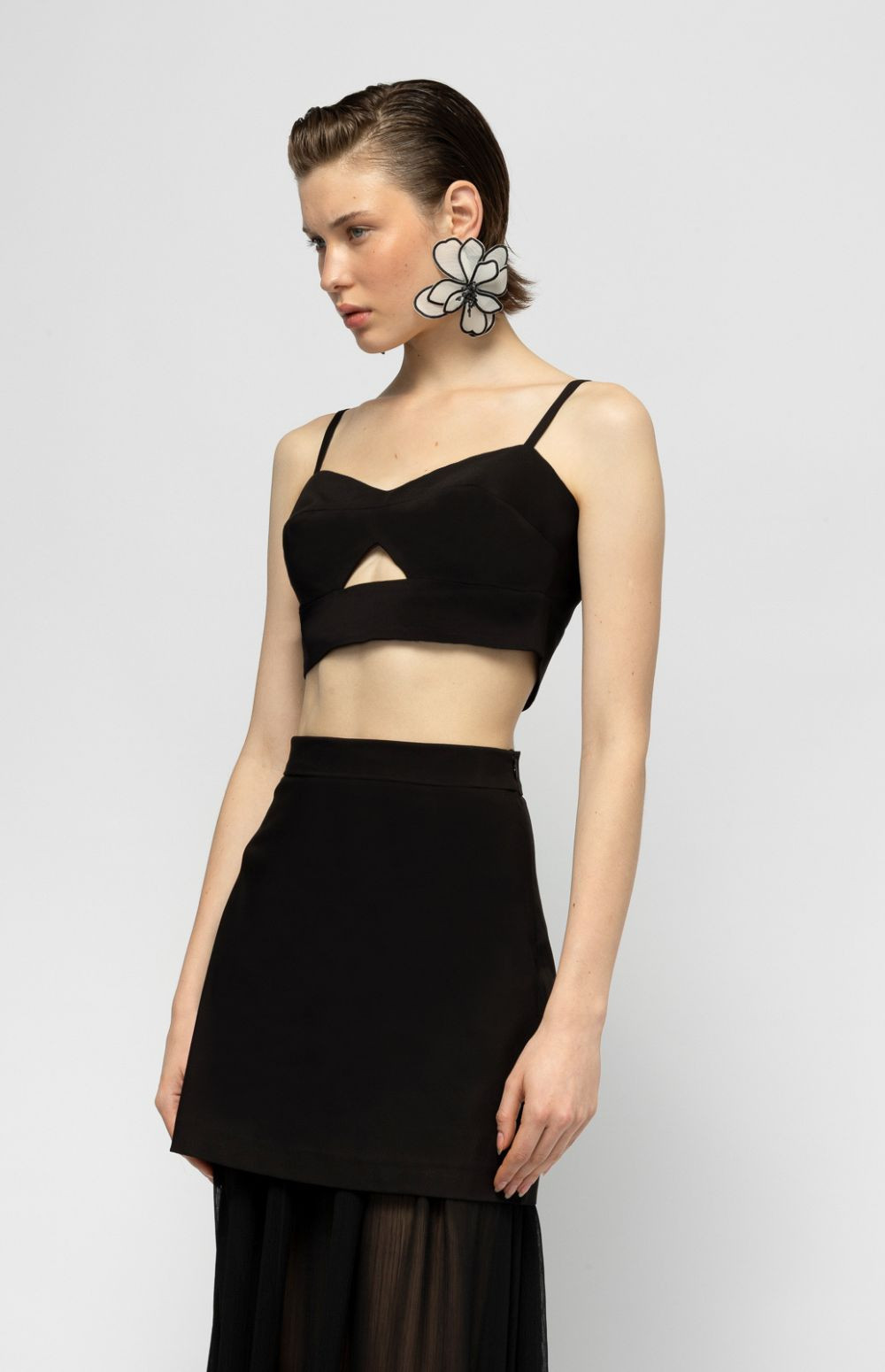 A black cropped top with delicate straps and a subtle front cut-out — minimal, modern, and effortlessly striking.