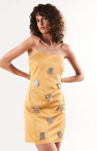 This strapless mini dress features a structured, fitted silhouette with distinctive rectangular shell-like applications or beaded embellishments across the front. It is crafted from a blend of 58% viscose and 42% cotton, with a 100% viscose lining.