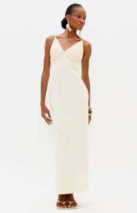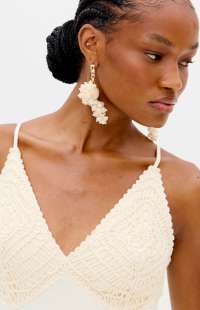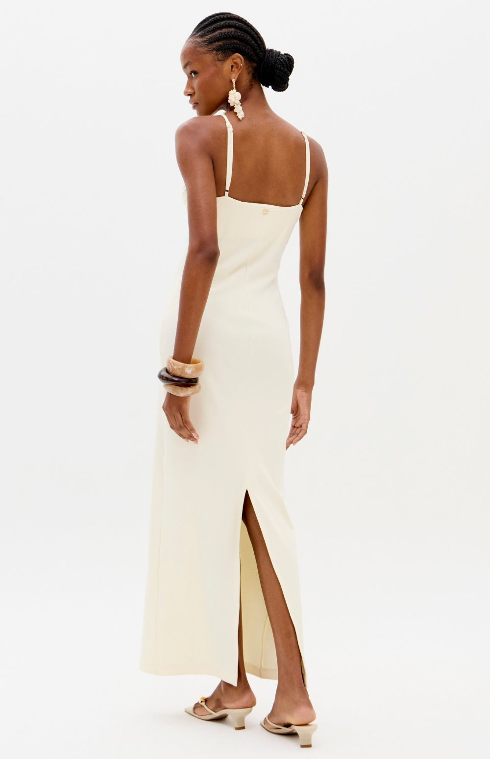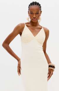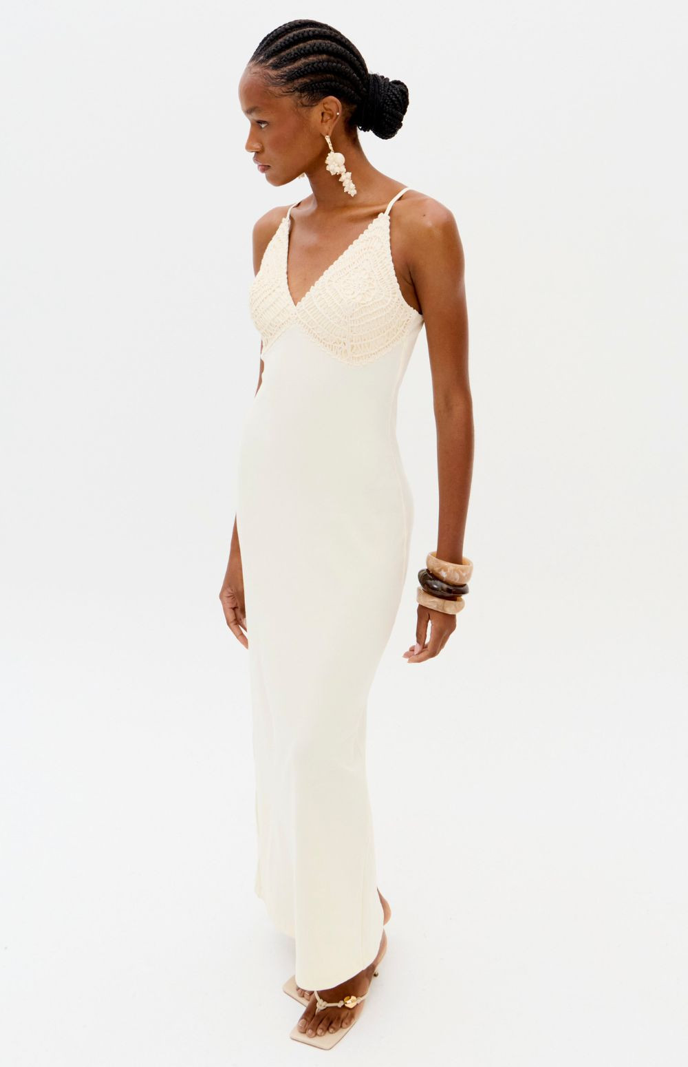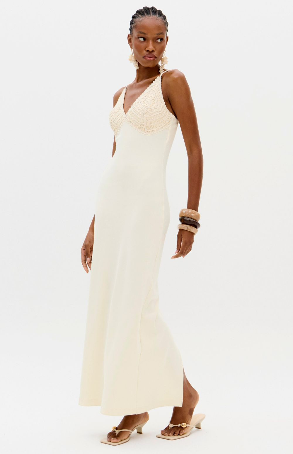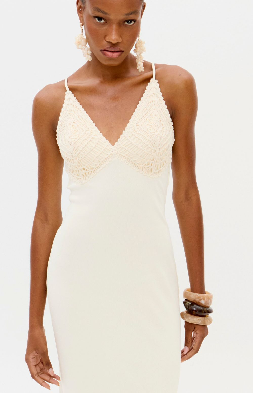 Made from a substantial knit fabric, this super midi dress features a V-neck, adjustable straps, and a fitted silhouette, as well as a back slit for added comfort. The crocheted bust stands out, highlighting the handcrafted aesthetic that's prominent this season.