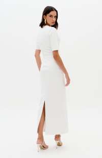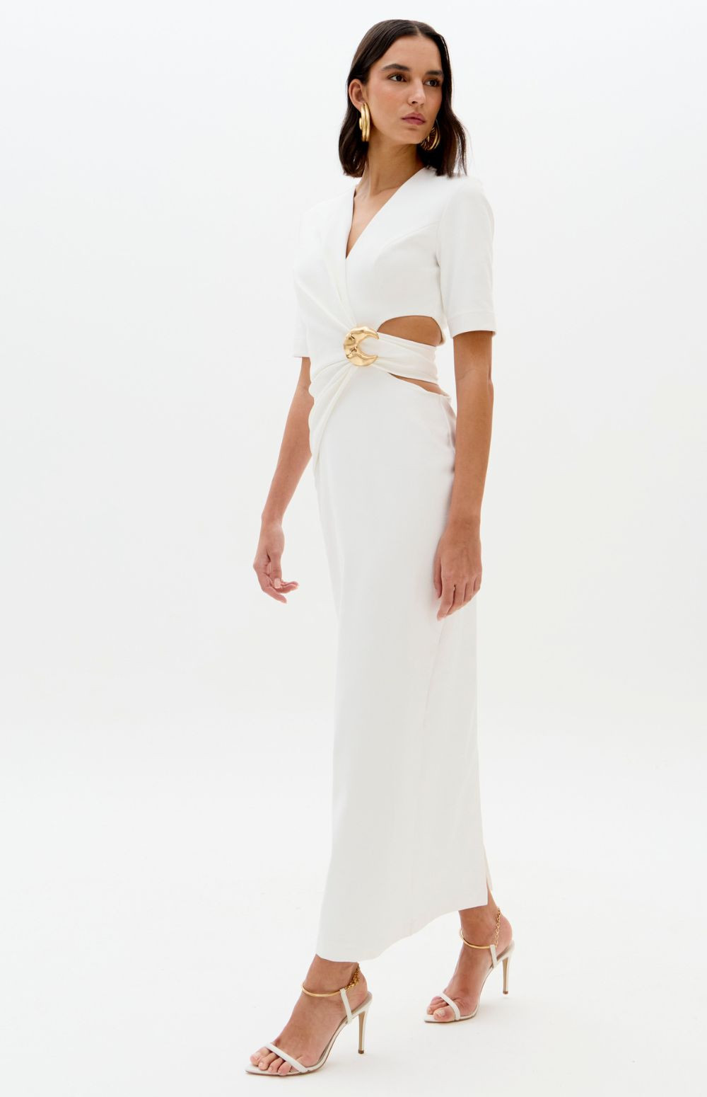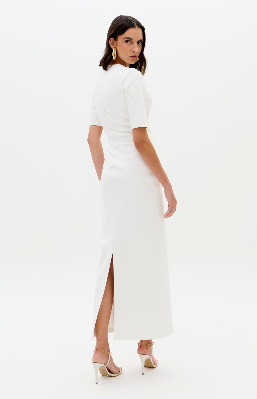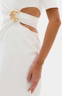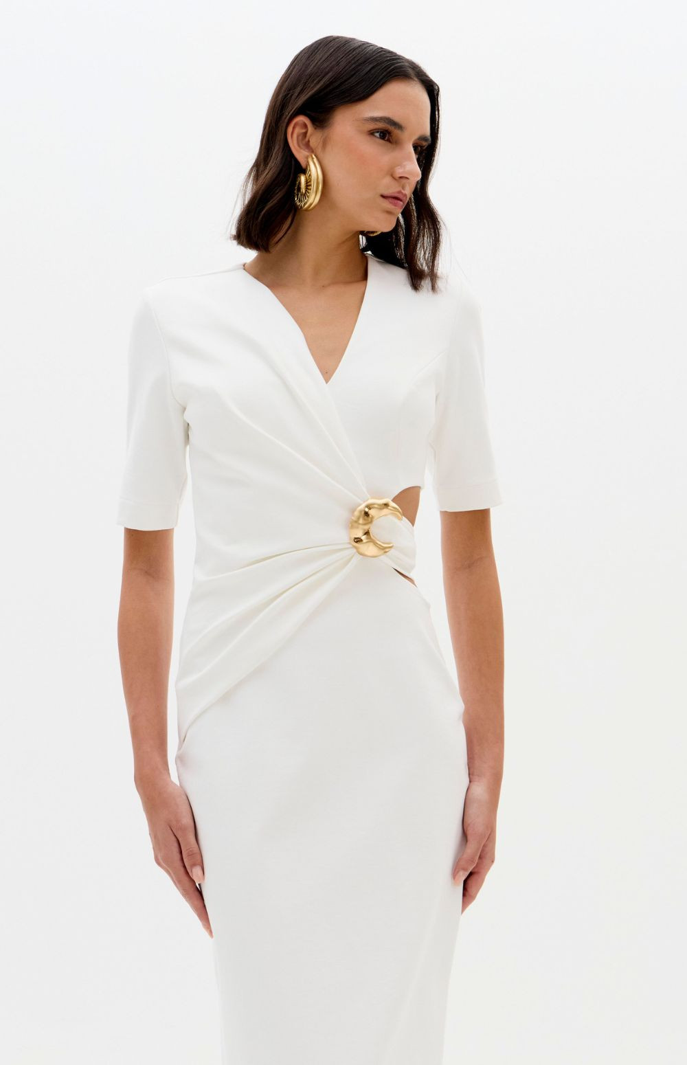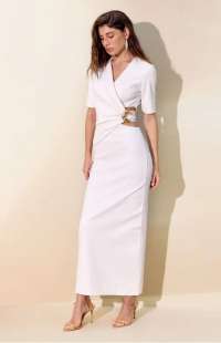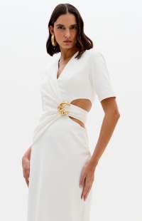 This super midi knit dress features short sleeves, a V-neck, a zipper closure, and a back slit. With a body-hugging fit, it stands out with a side cutout featuring metallic trim that adds a touch of sophistication to the look. Invest in it!
