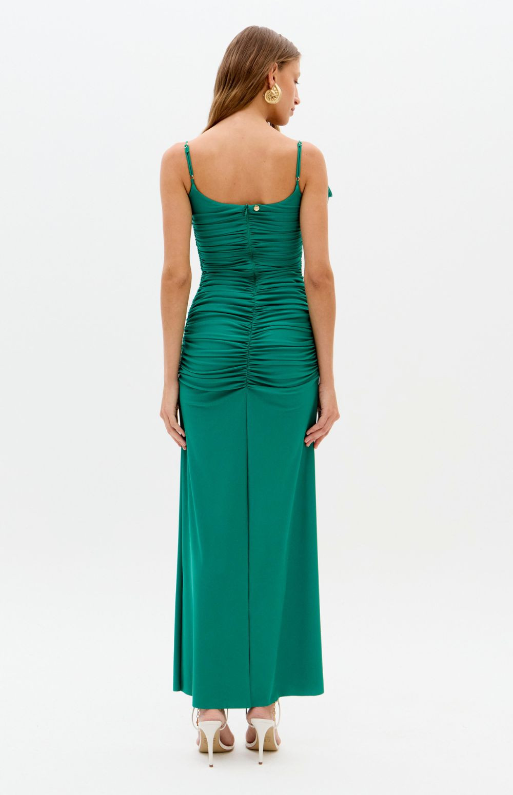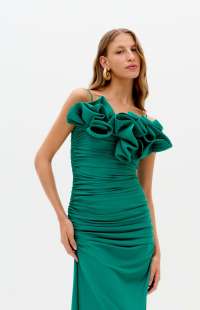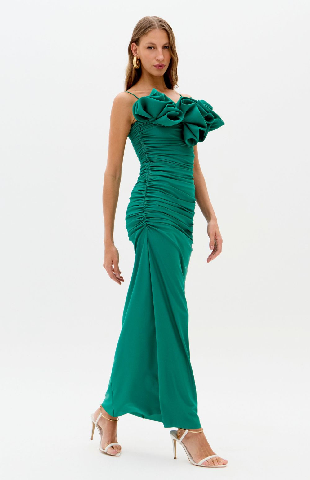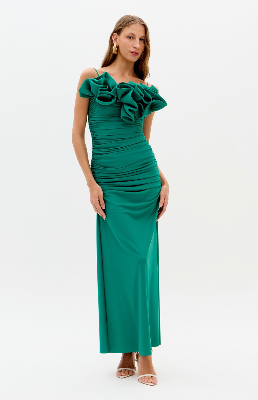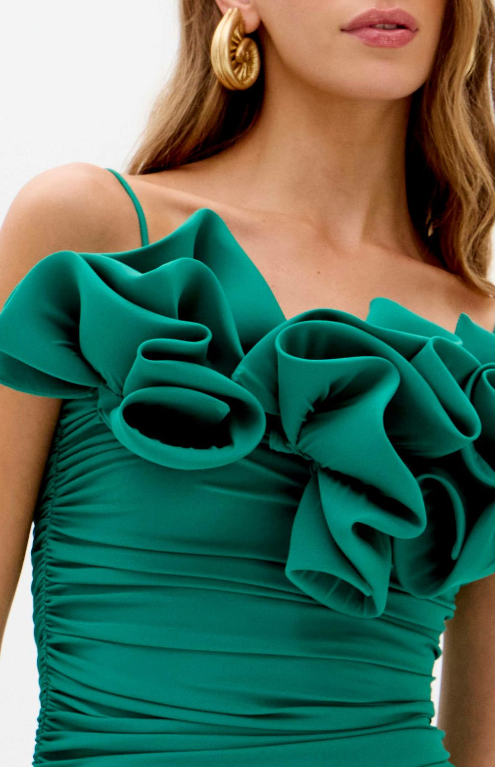 Vibrant green Lança Perfume Super Midi Dress. This form-fitting dress is characterized by its dramatic ruffles at the neckline, delicate adjustable straps, and ruched detailing throughout the body.