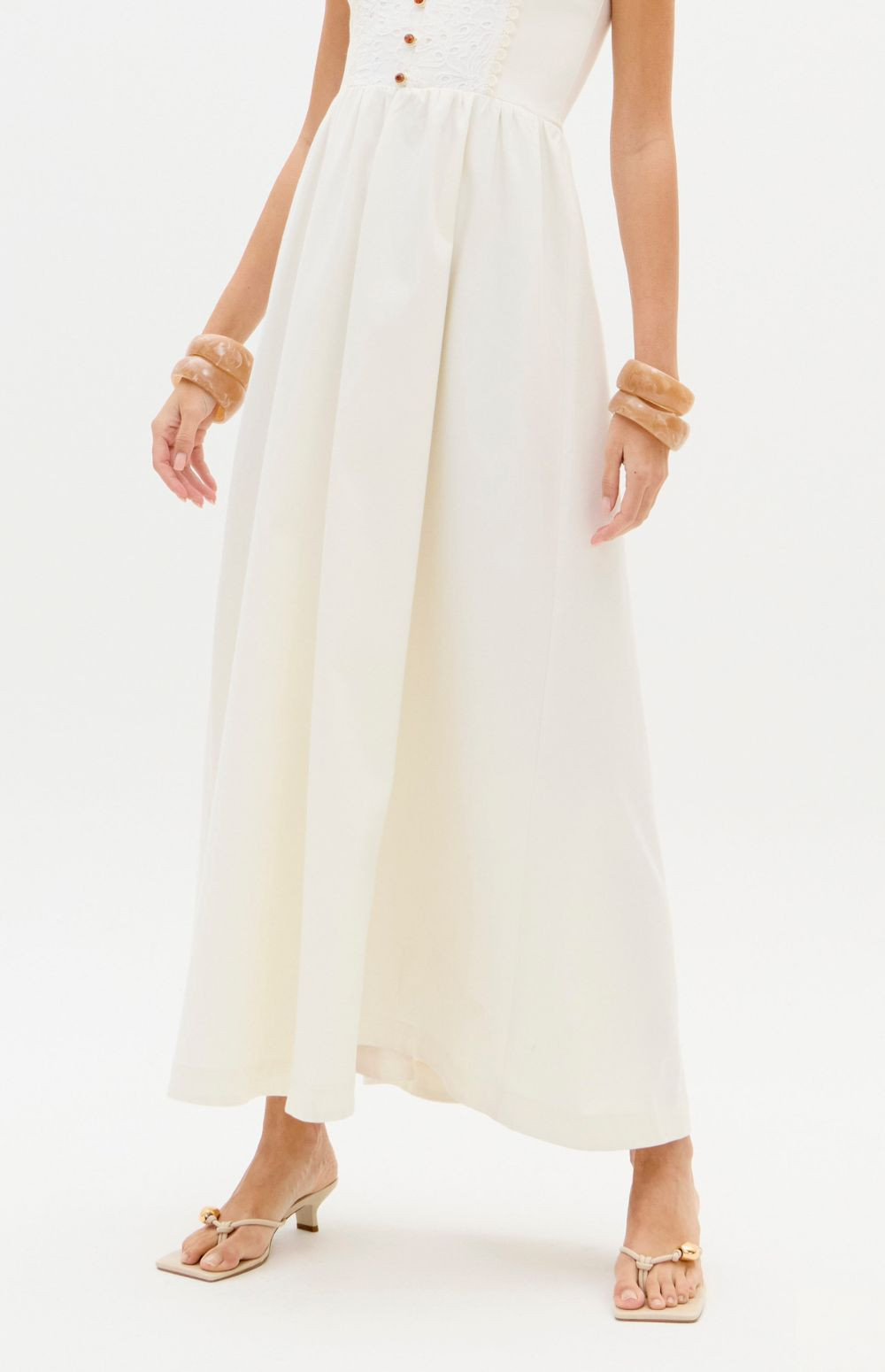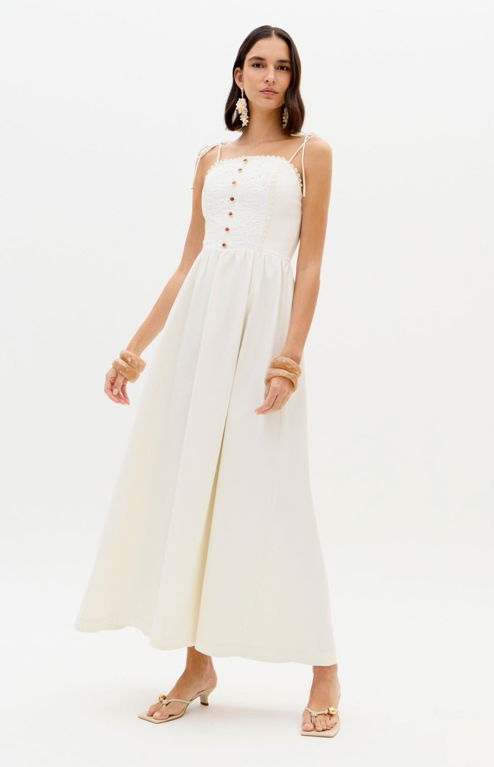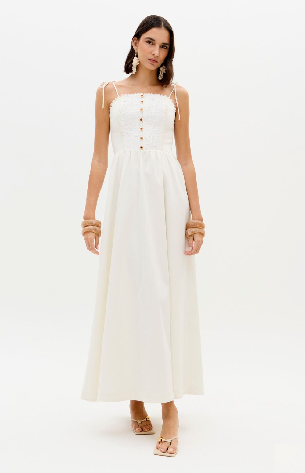 This super midi dress is made from lightweight cotton fabric. The fitted bust with lace appliqué is complemented by a straight neckline, decorative buttons, and thin tie straps. The skirt has a soft volume, balancing romance and freshness.