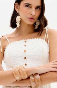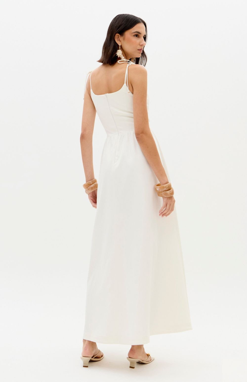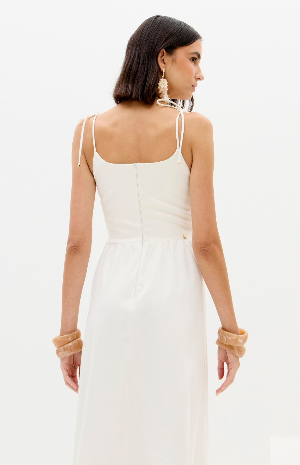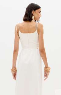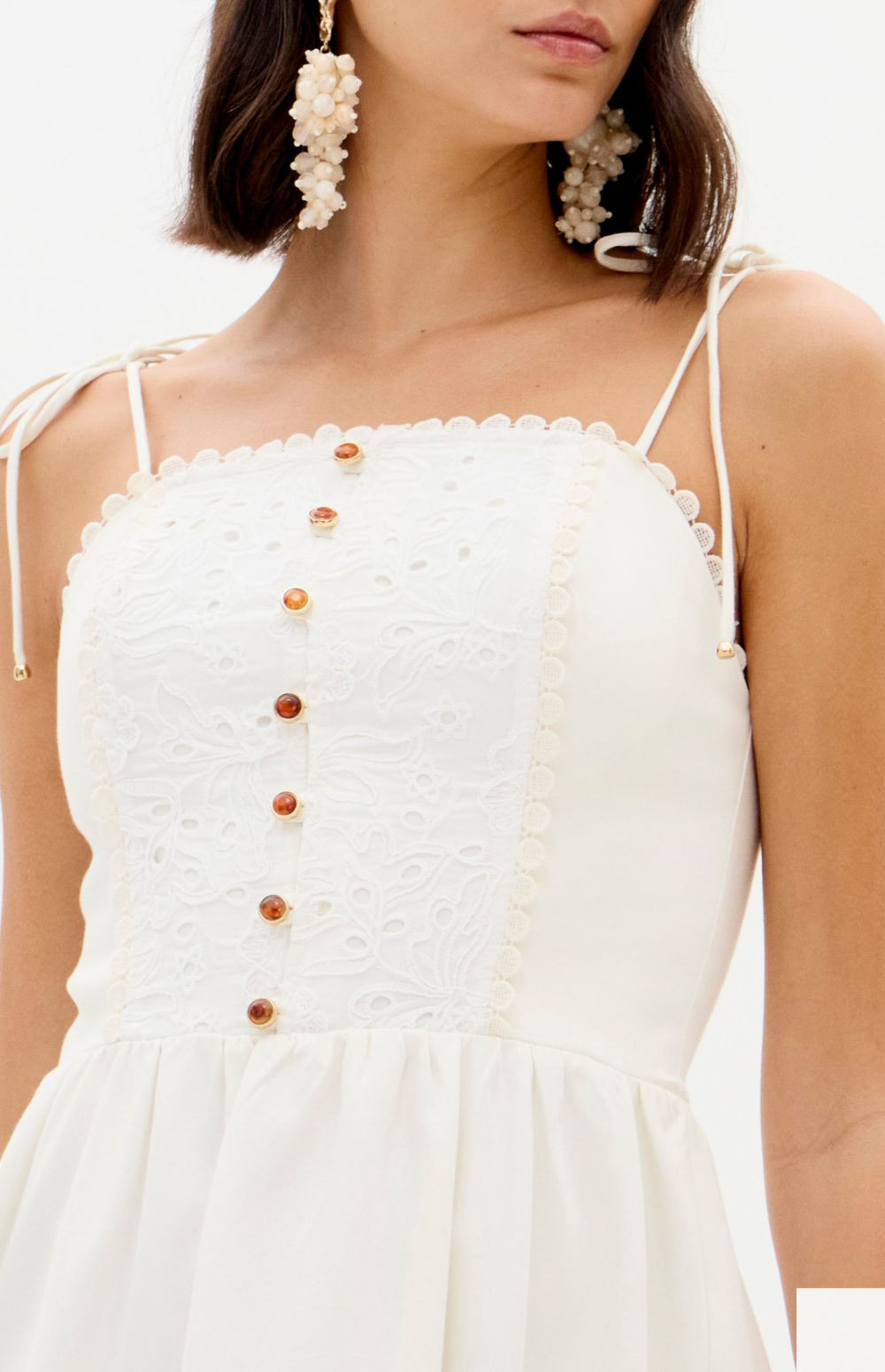 This super midi dress is made from lightweight cotton fabric. The fitted bust with lace appliqué is complemented by a straight neckline, decorative buttons, and thin tie straps. The skirt has a soft volume, balancing romance and freshness.