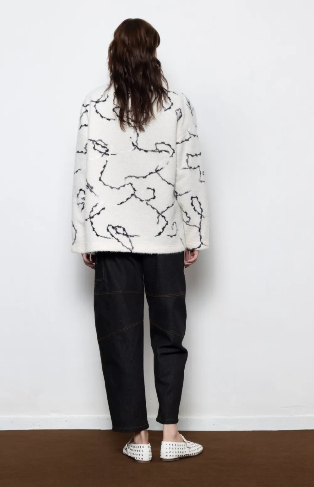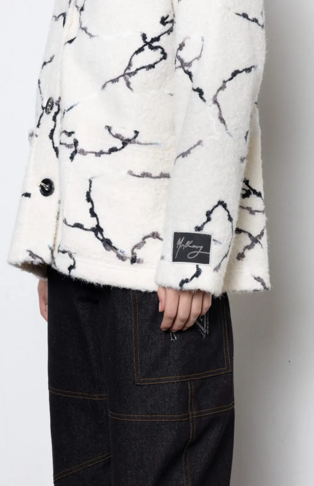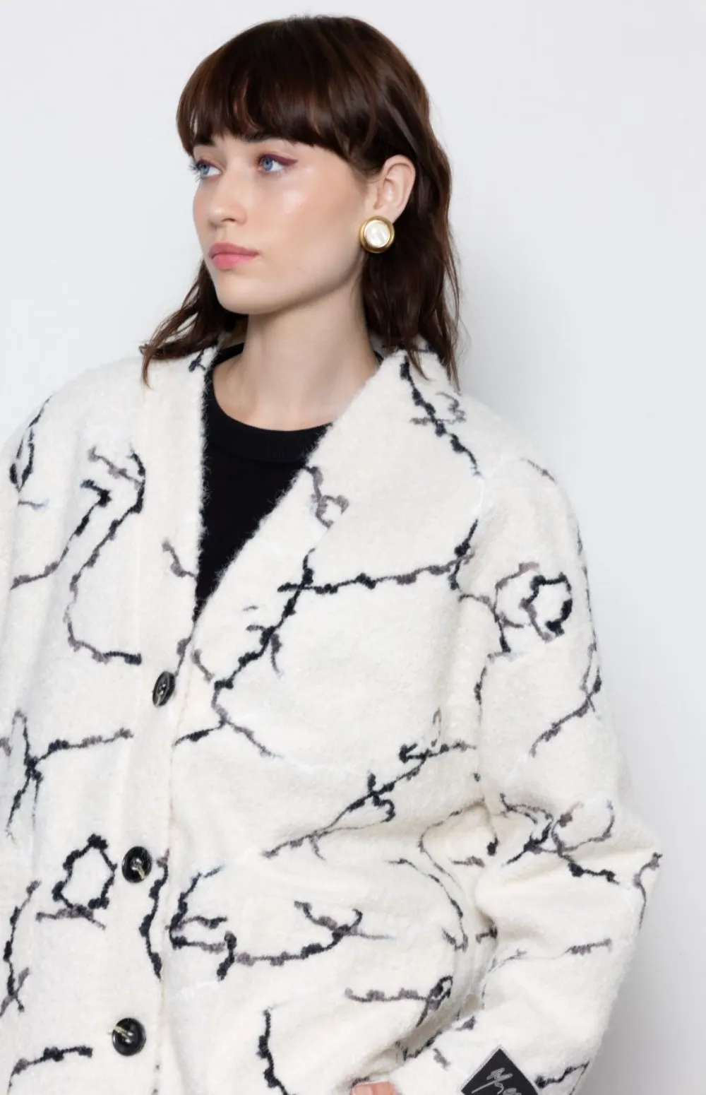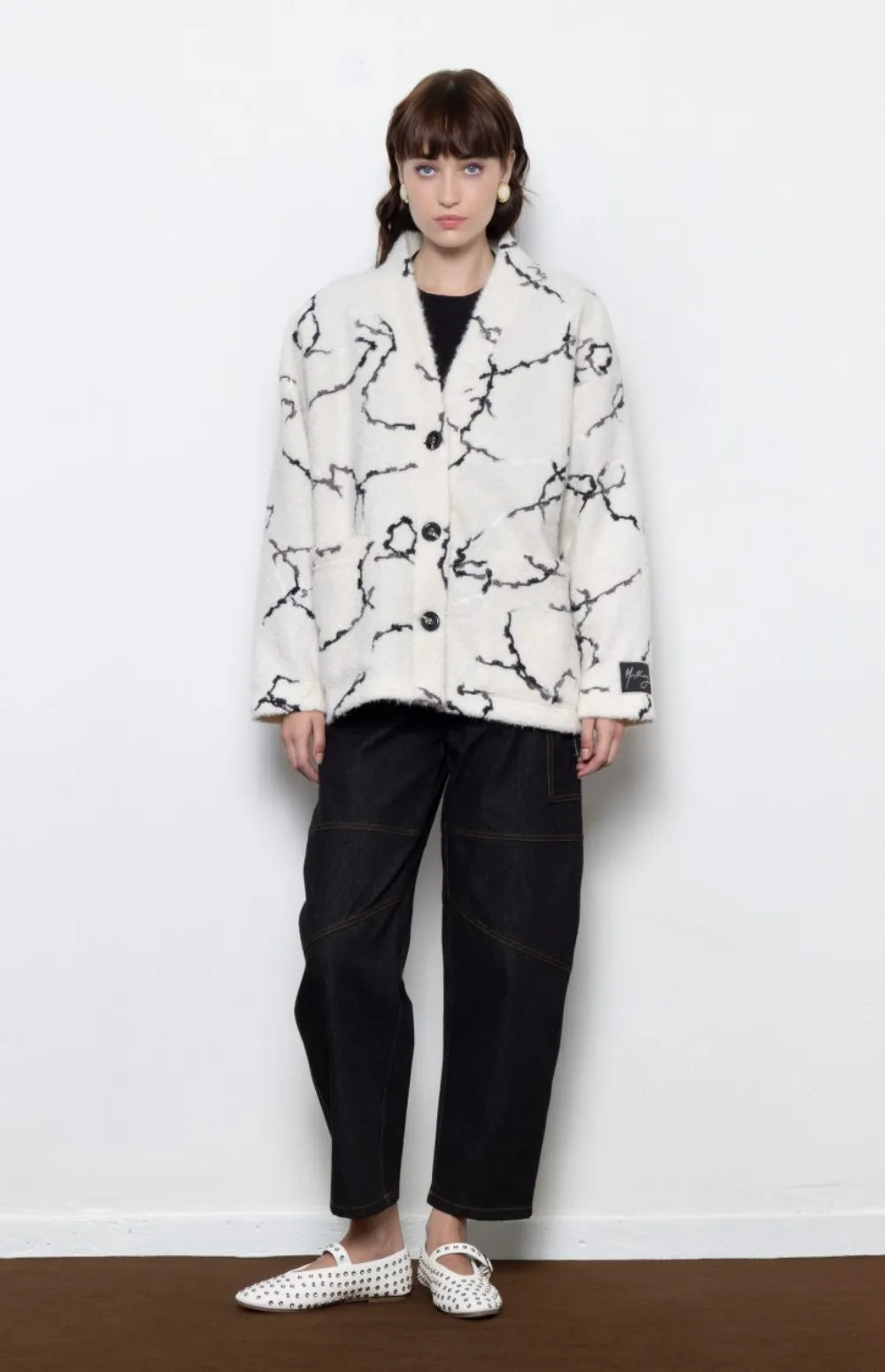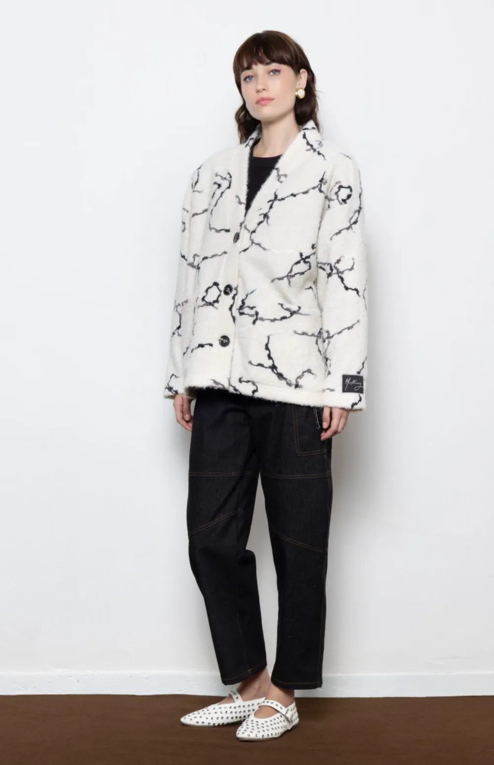 Textured button-up jacket with abstract black embroidery —artsy, cozy, and effortlessly cool.