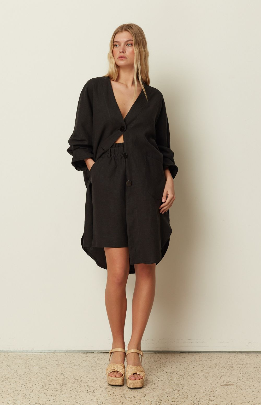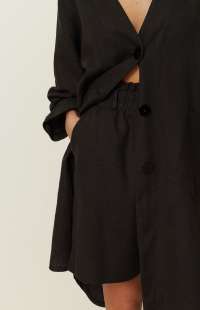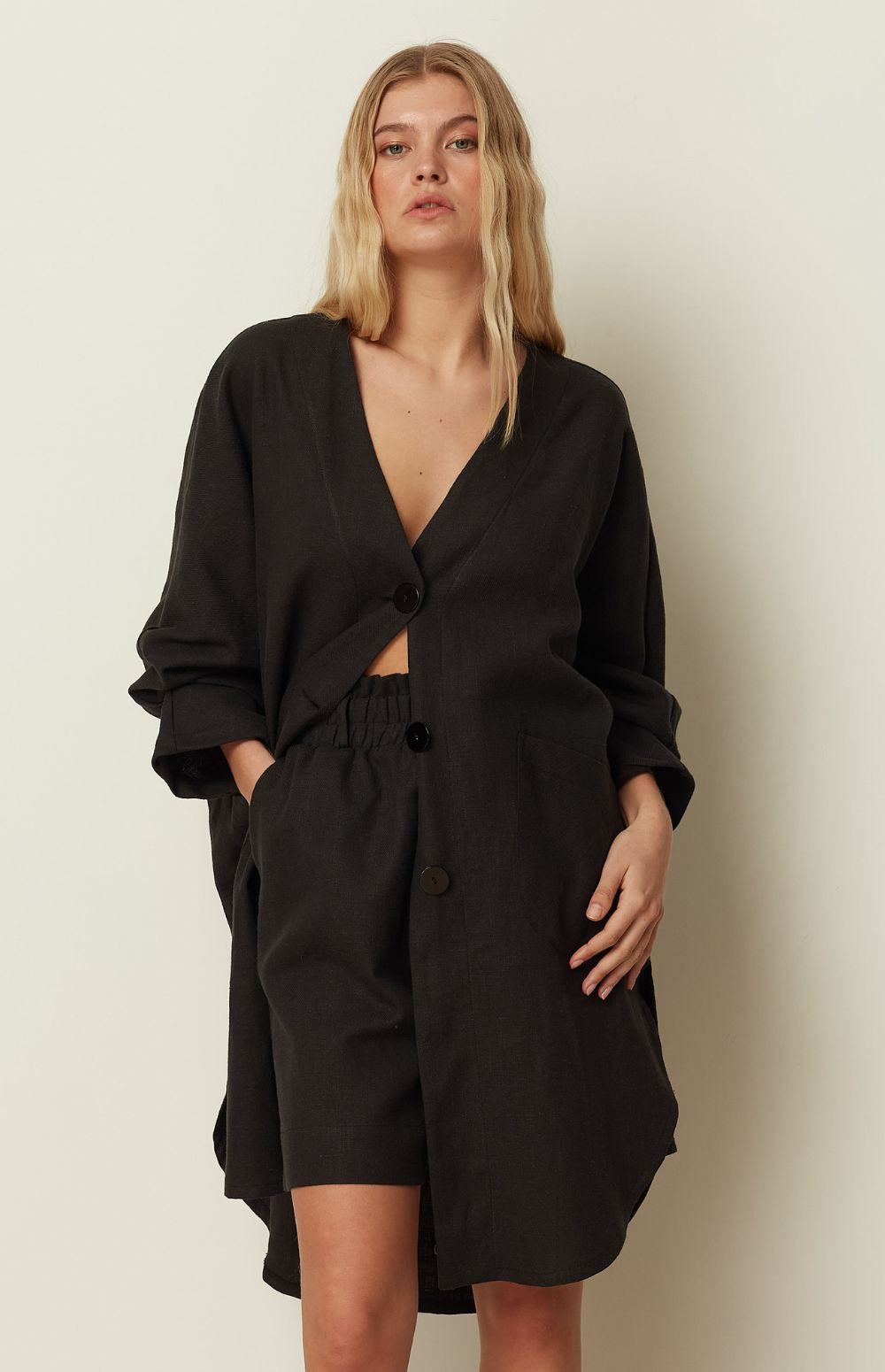 Effortless and breathable, this ckontova short shirt dress is cut in a relaxed oversized silhouette with a deep V-neckline and a clean button-front closure. Designed with roomy patch pockets and softly rolled sleeves, it features a curved hem with a longer back for easy movement and coverage. Wear it as a standalone mini dress with flat sandals, belt it to define the waist, or style it open as a lightweight layer over swimwear.