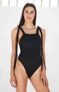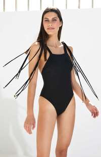 One-piece swimsuit with eight (8) straps on each shoulder, decorated with metallic beads at their end. They are adjustable to the height that anyone desires.