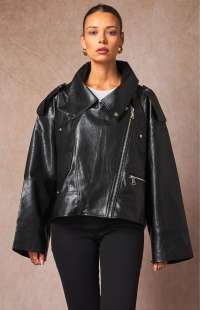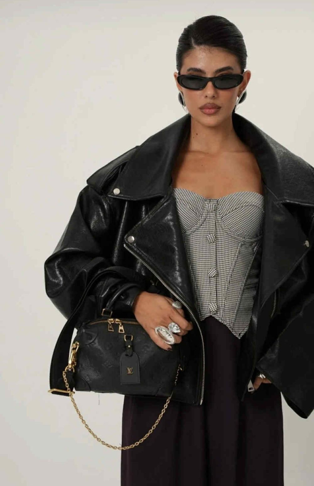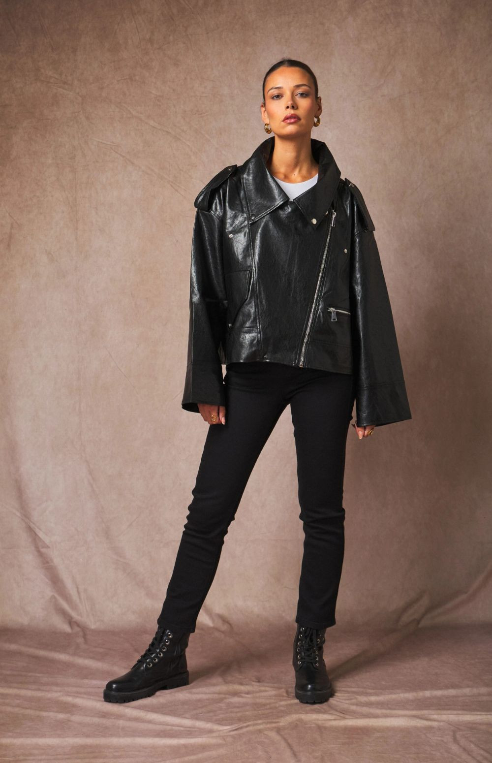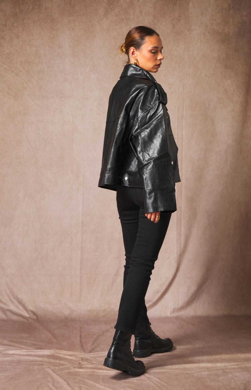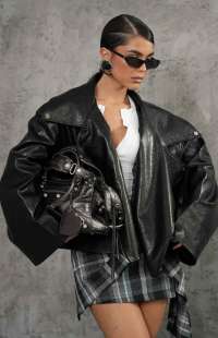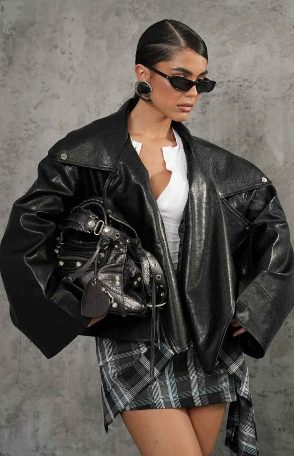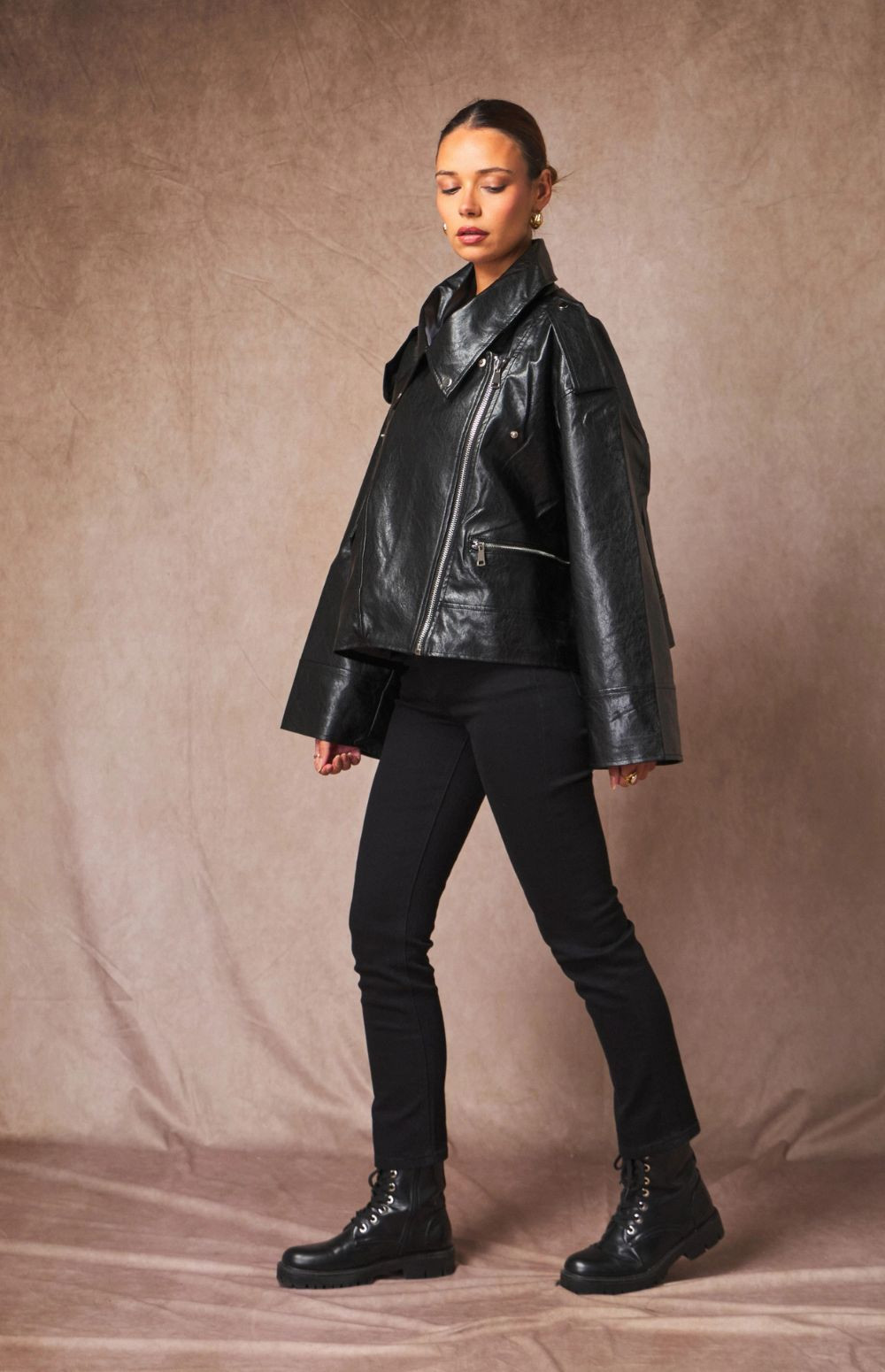 Composition: Napa (high-quality synthetic leather)Design: Inspired by the classic biker jacket, featuring an asymmetrical metal closure and flap pockets with snap buttons.